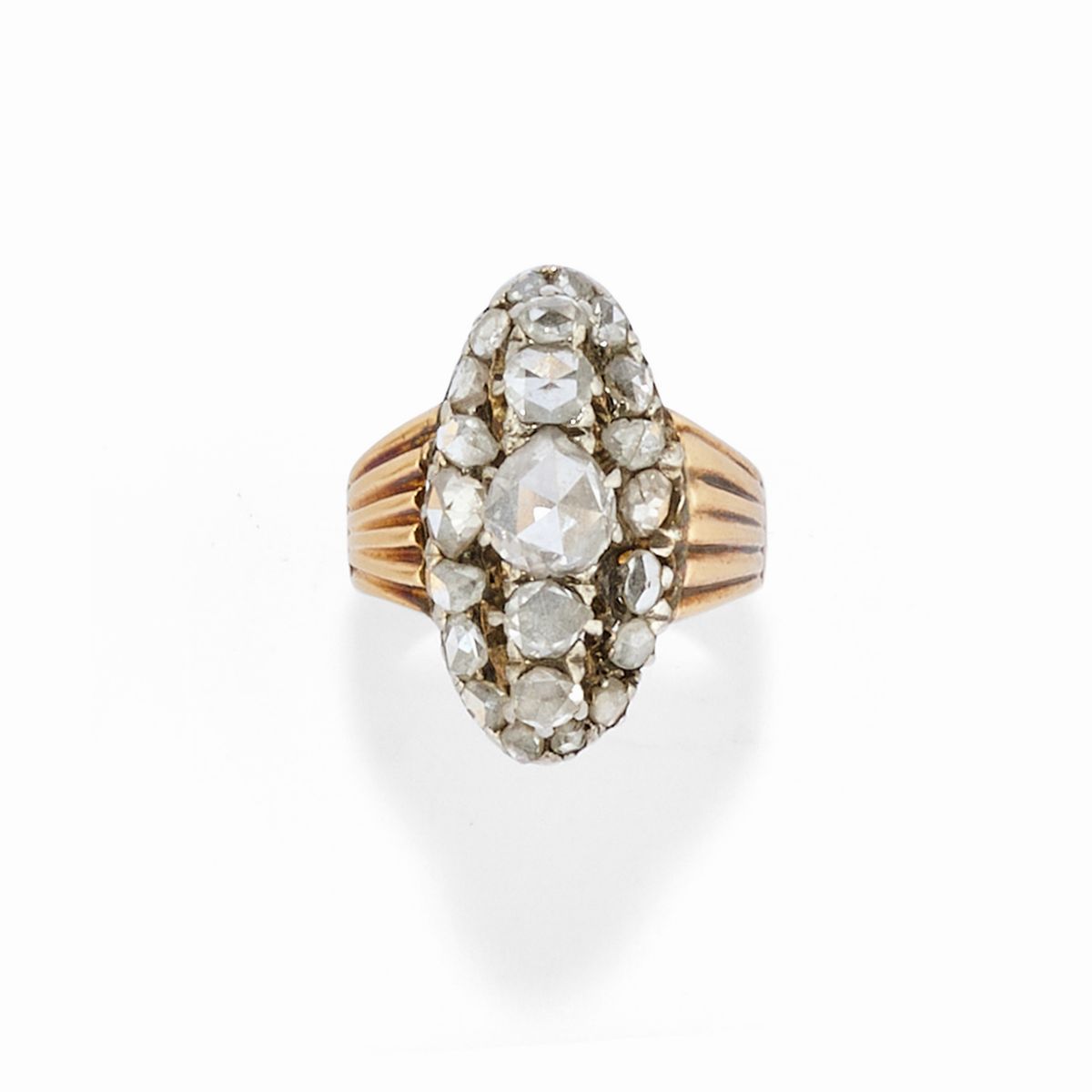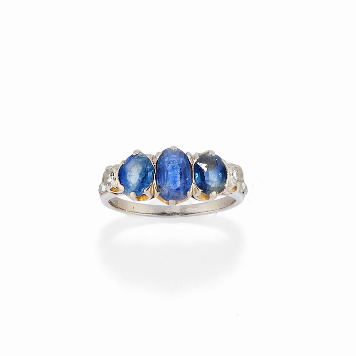 18k two-color gold and silverone with a lozenge pattern with rose cut diamonds, one with oval cut sapphires and diamonds, and one with oval cut sapphire and ruby and diamonds.