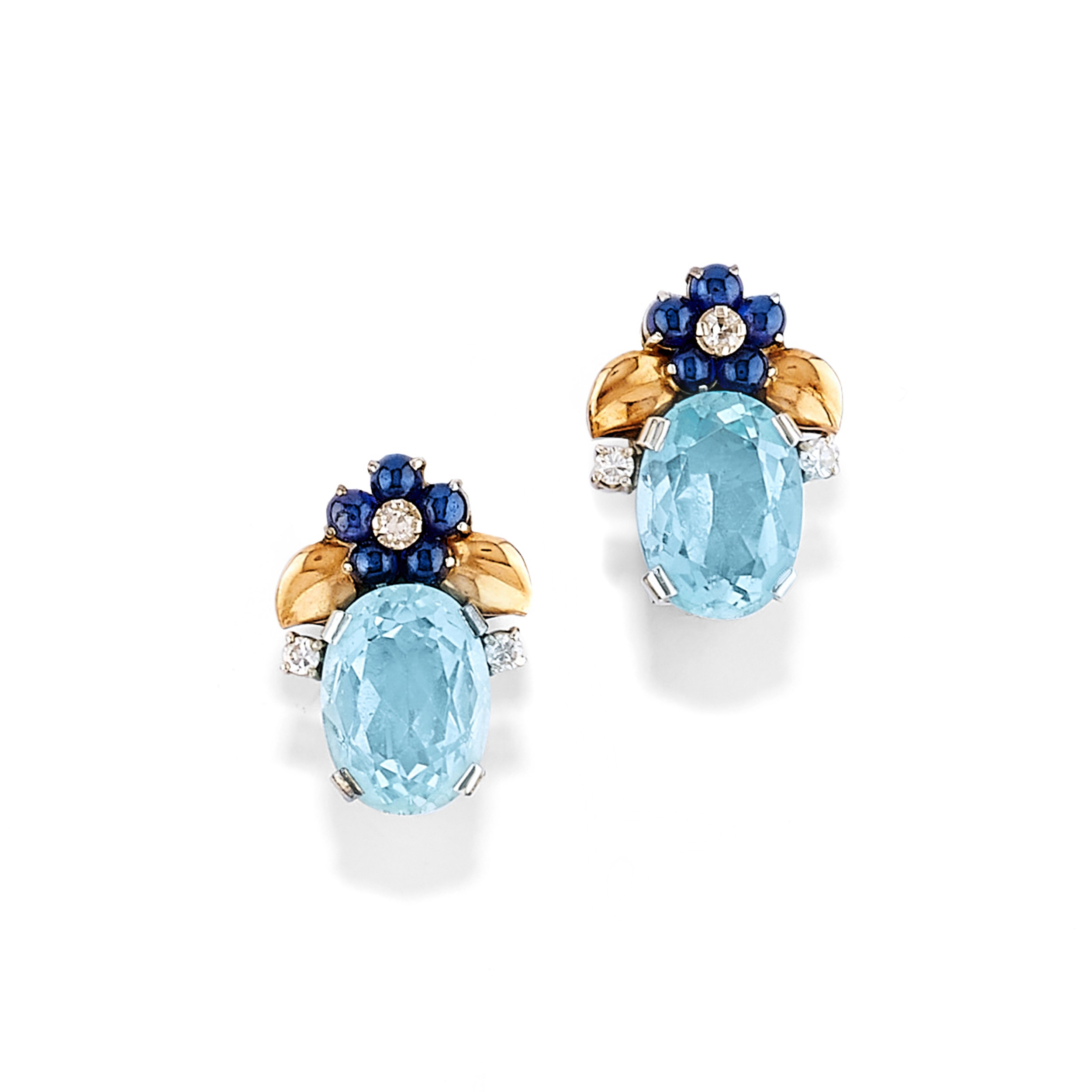 of floral taste with rectangular-cut aquamarines with octagonal and oval outline totaling approx. ct 37,00, round-cut cabochon sapphires and brilliant-cut diamonds, consisting of brooch and pair of clip-on earrings, with case.