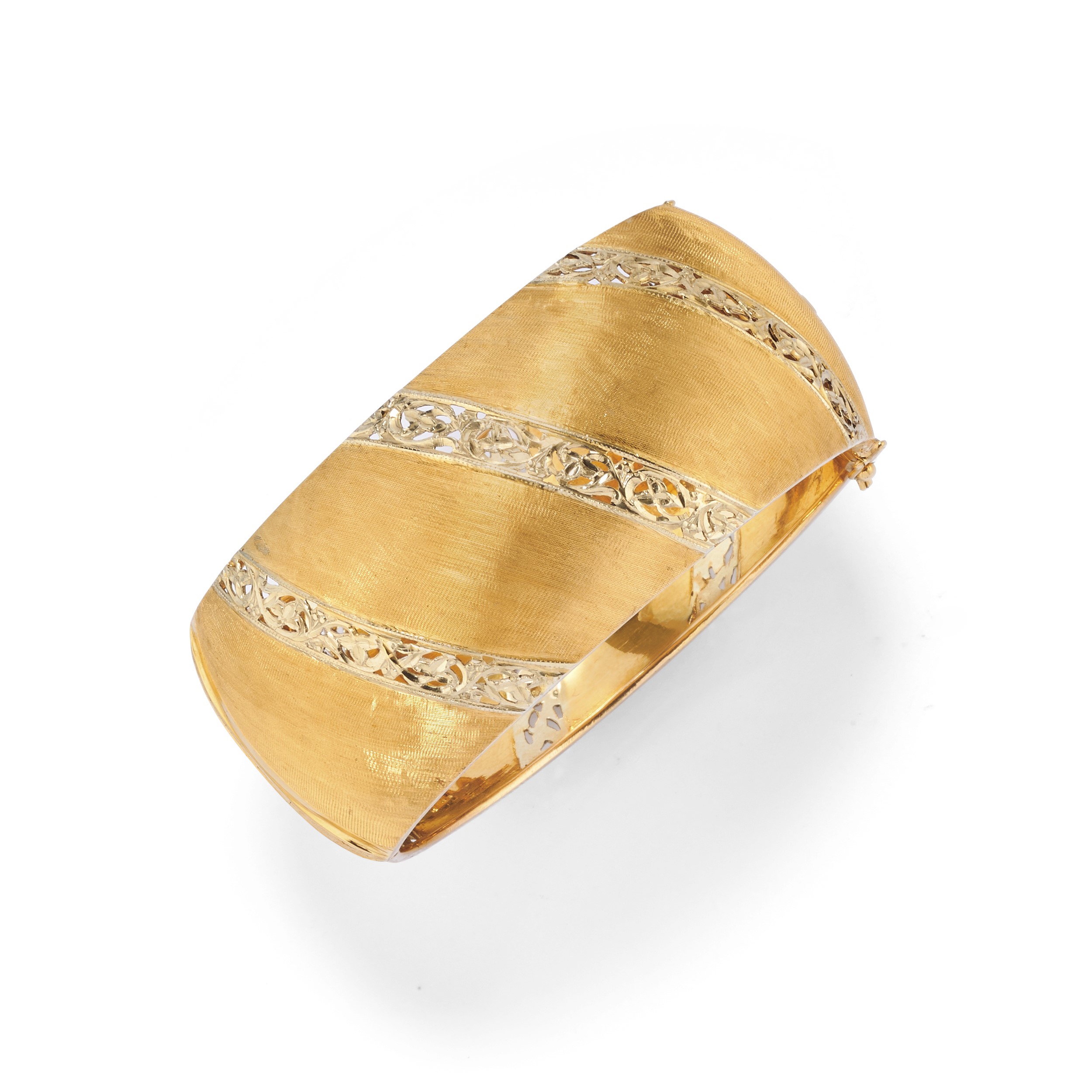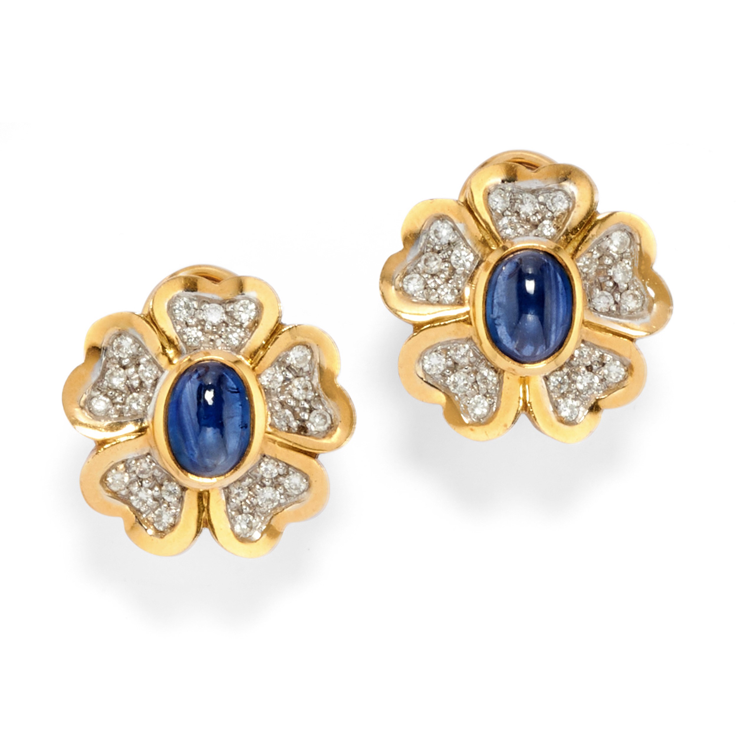 18k two-color goldsatin gold bangle with openwork motifs, flower earrings with cabochon oval-cut sapphires and brilliant-cut diamonds, fitted with posts.