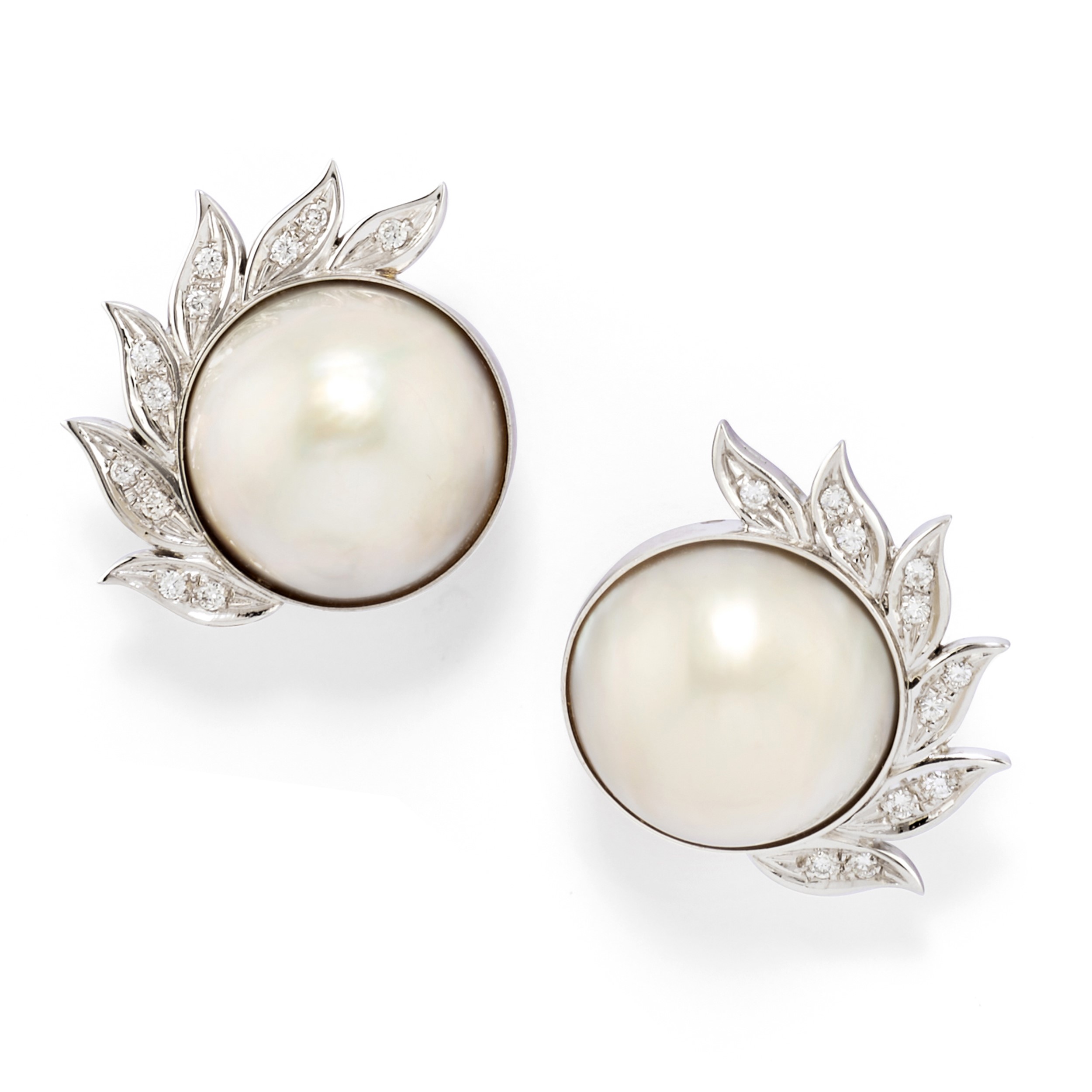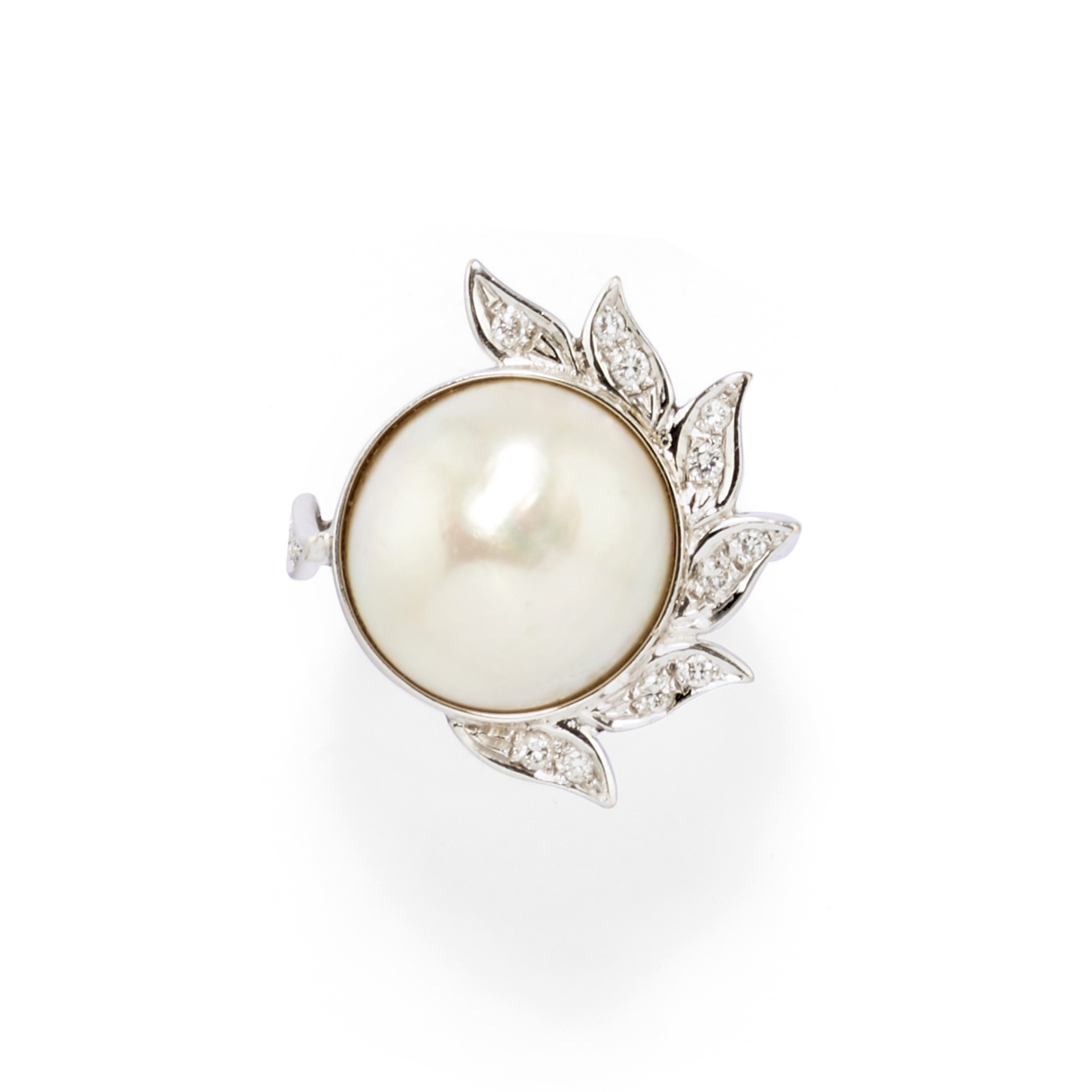 comprising a ring and a pair of earrings fitted with posts, centre set with approximately mm 17,00/20,00 mabé cultured pearls, brilliant-cut diamonds totalling approximately ct 1,00.