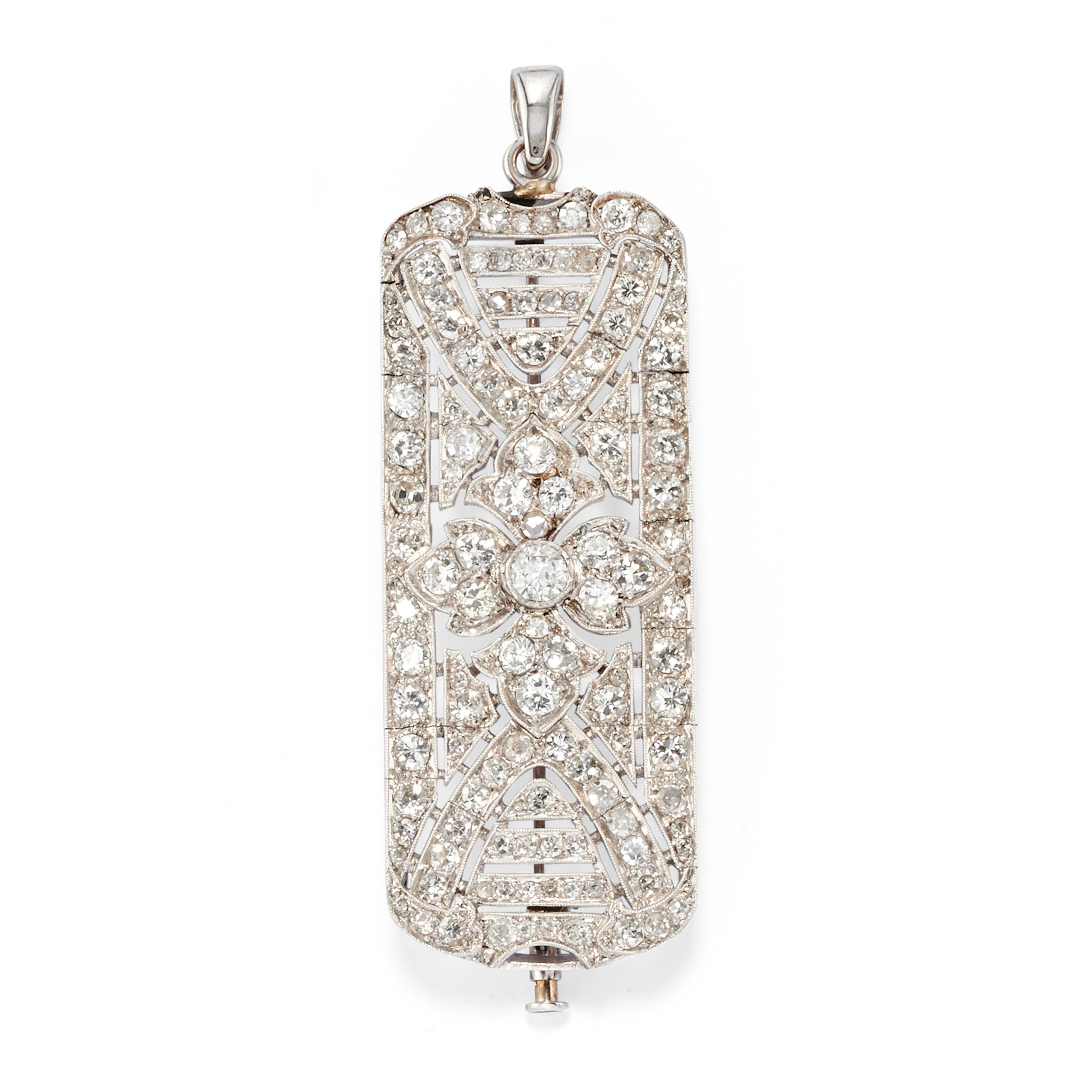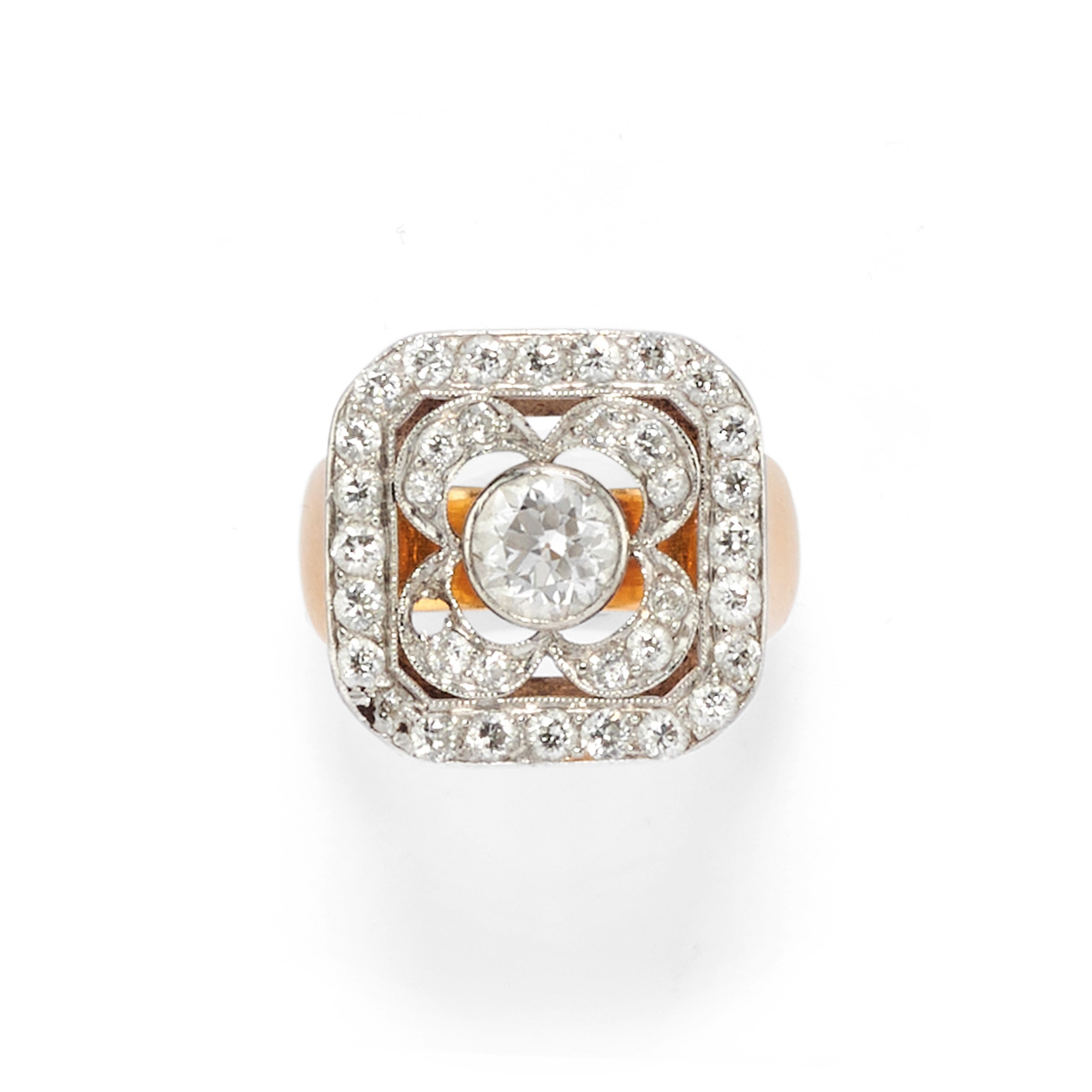 18k two-gold and platinumpendant-brooch with old and huit-huit cut diamonds totalling approx. ct 5,00; ring with old- and brilliant-cut diamonds totalling approx. ct 1,00, defects (one diamond missing).