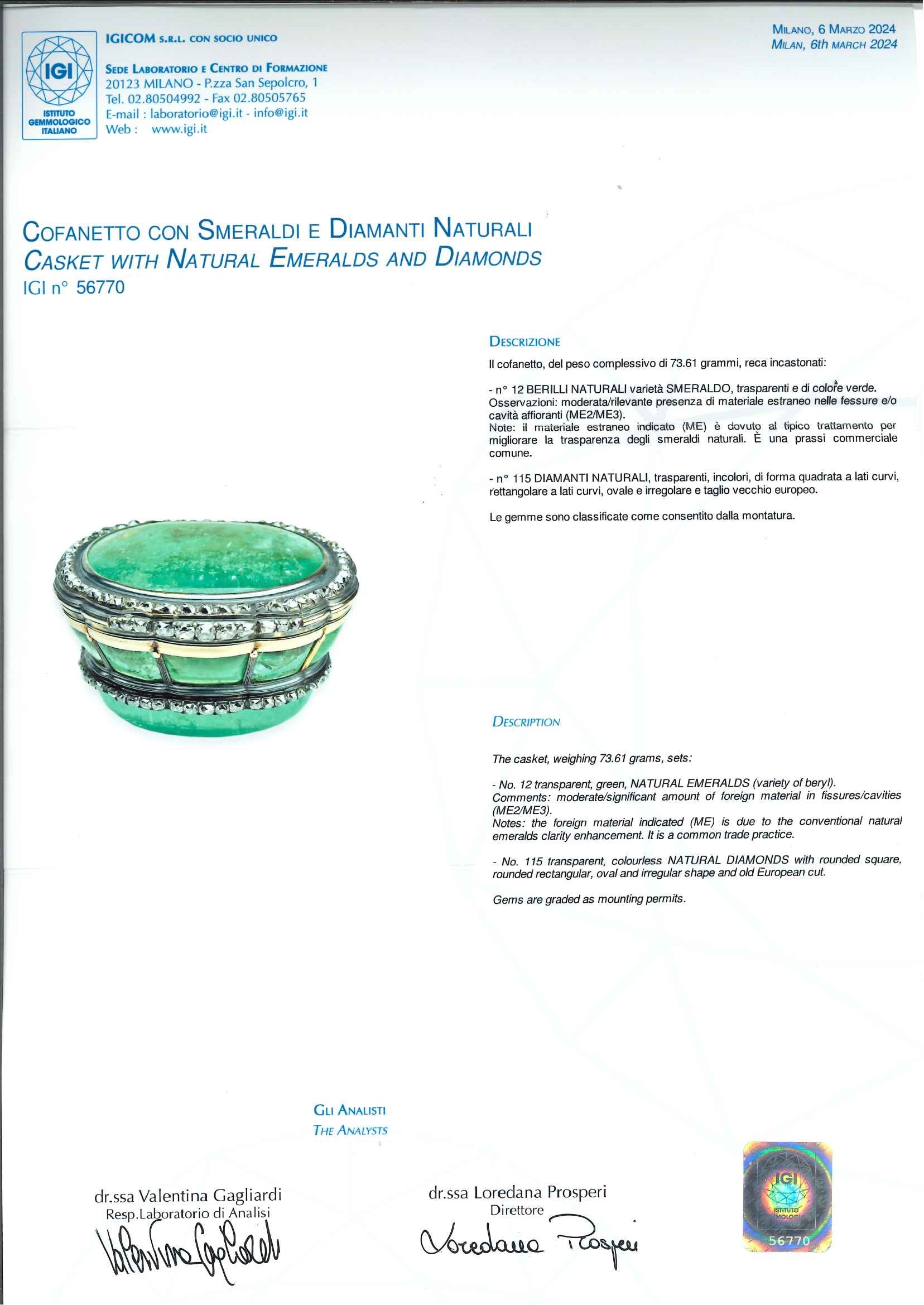 The casket box is accompanied by gemmological certificate n. 56770 dated 6/03/2024, IGI Milan.