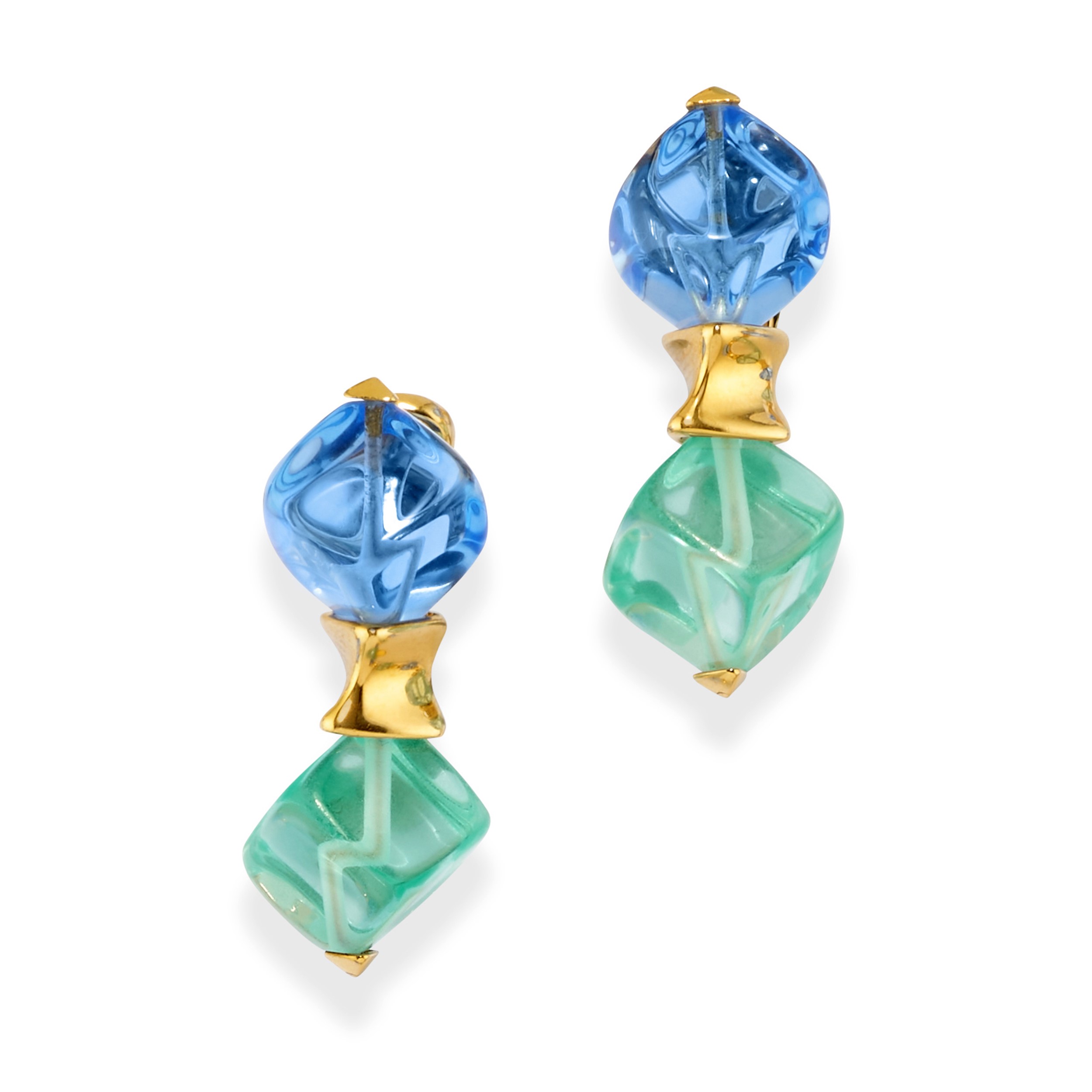 18k yeallow goldcomprising a necklace and a pair of pendant earrings fitted with posts, green and blue quartz nut inserts.