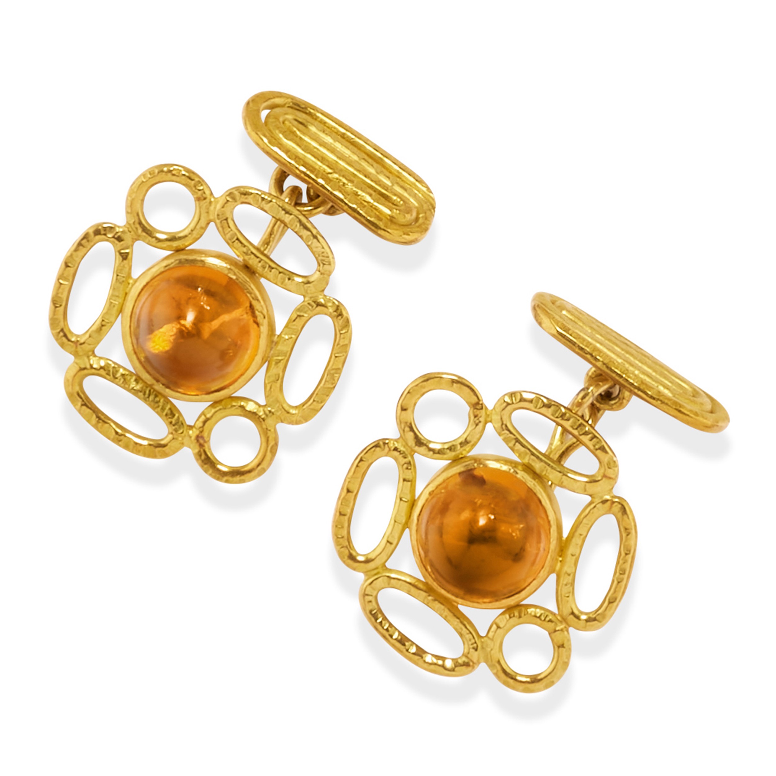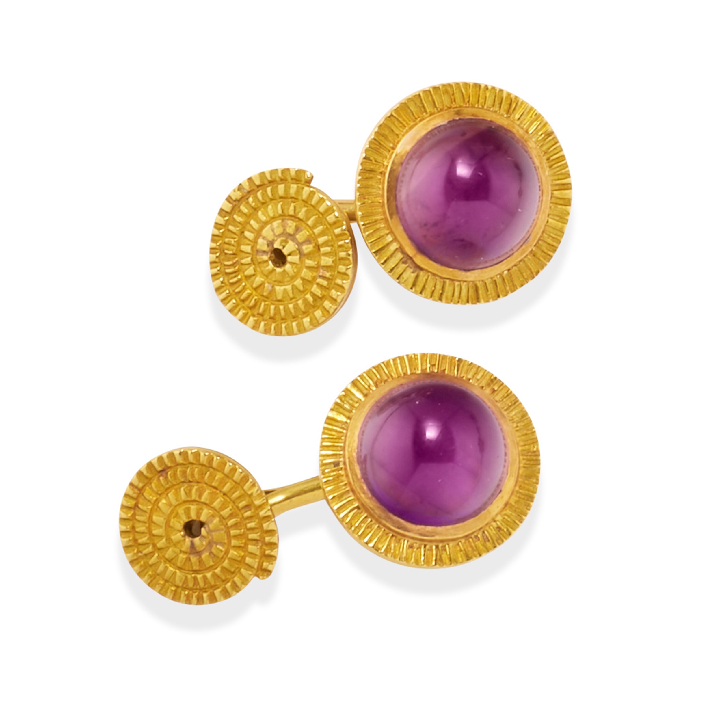 18k yellow goldof various shapes and decorations, with round-cut amber and amethyst cabochons.