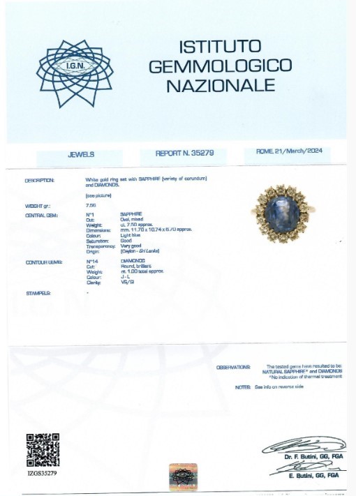 18k white goldCeylon oval-cut sapphire approximately ct 7,50 in the centre, surrounded by brilliant-cut diamonds totalling approximately ct 1,00, color J/L, clarity VS/SI.