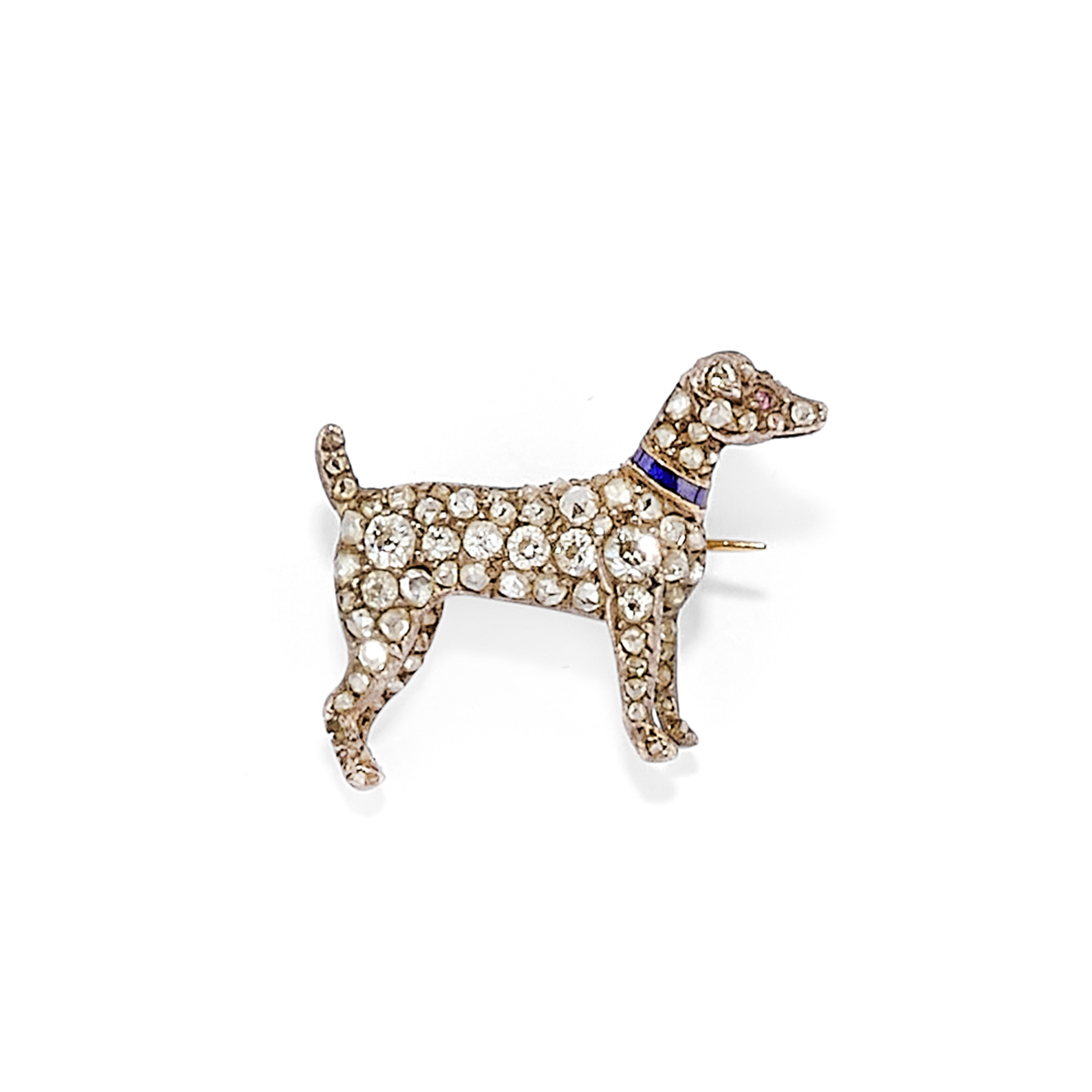 18k yellow gold and silverone in the shape of a dog with old and rose-cut diamonds, enamel collar and red stone eye, the other oval-shaped with microbeads and rose-cut diamonds, milligrain work.