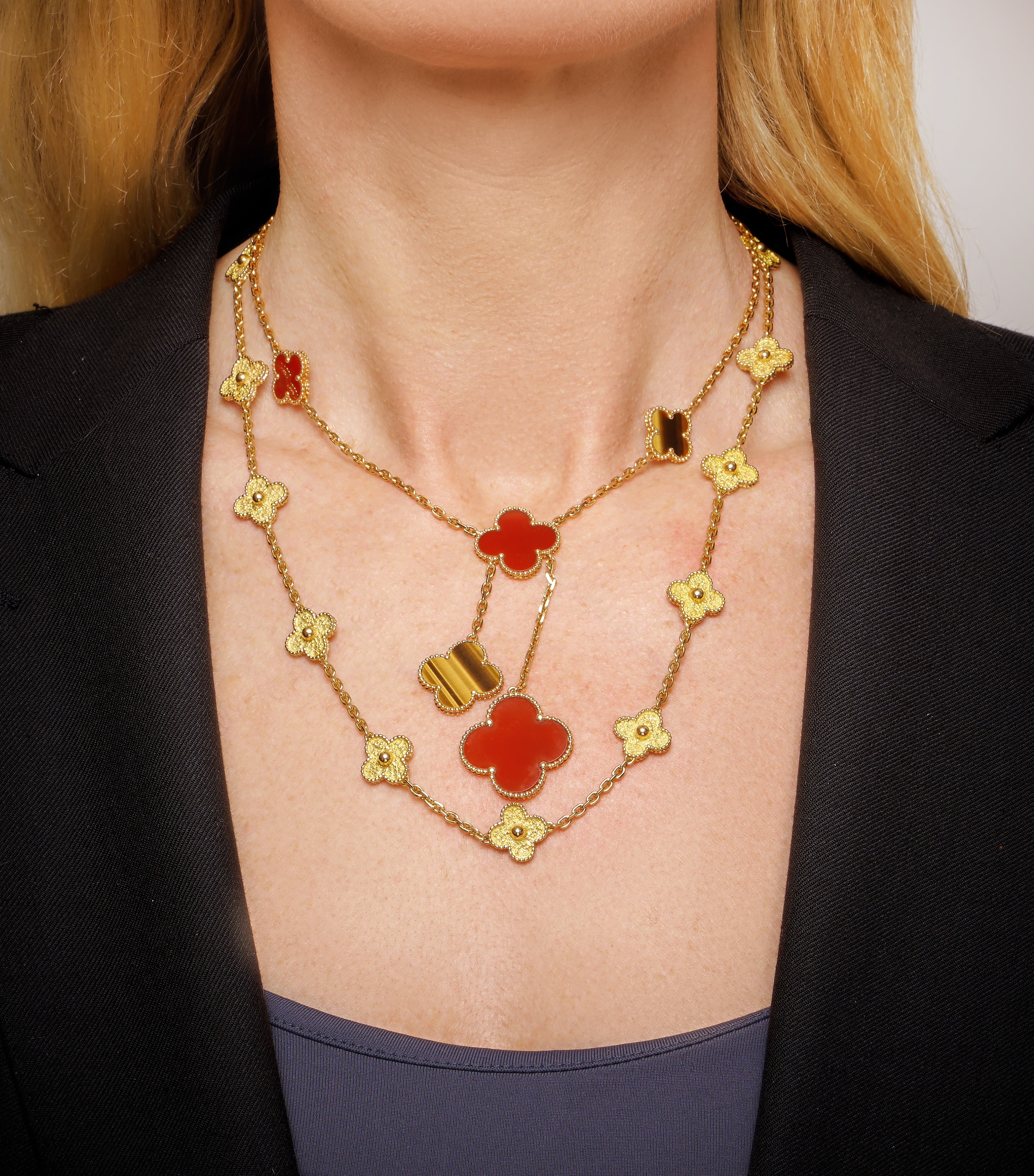 18k yellow goldring link with six cloverleaf motifs in carnelian and tiger's eye, with pouch.