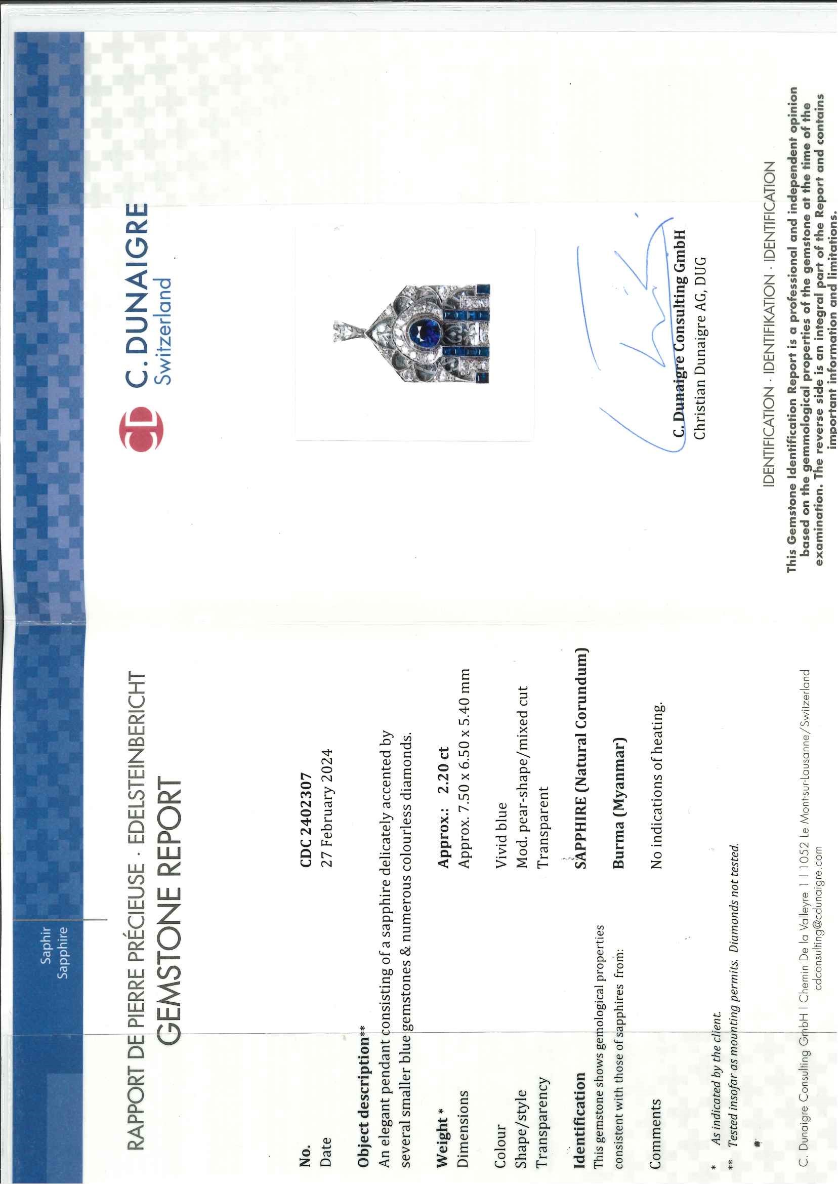 The sapphire, which shows no indication of heat treatment, is accompanied by gemmological certificate n. CDC 2402307 dated 27/02/2024, C. Dunaigre Switzerland.