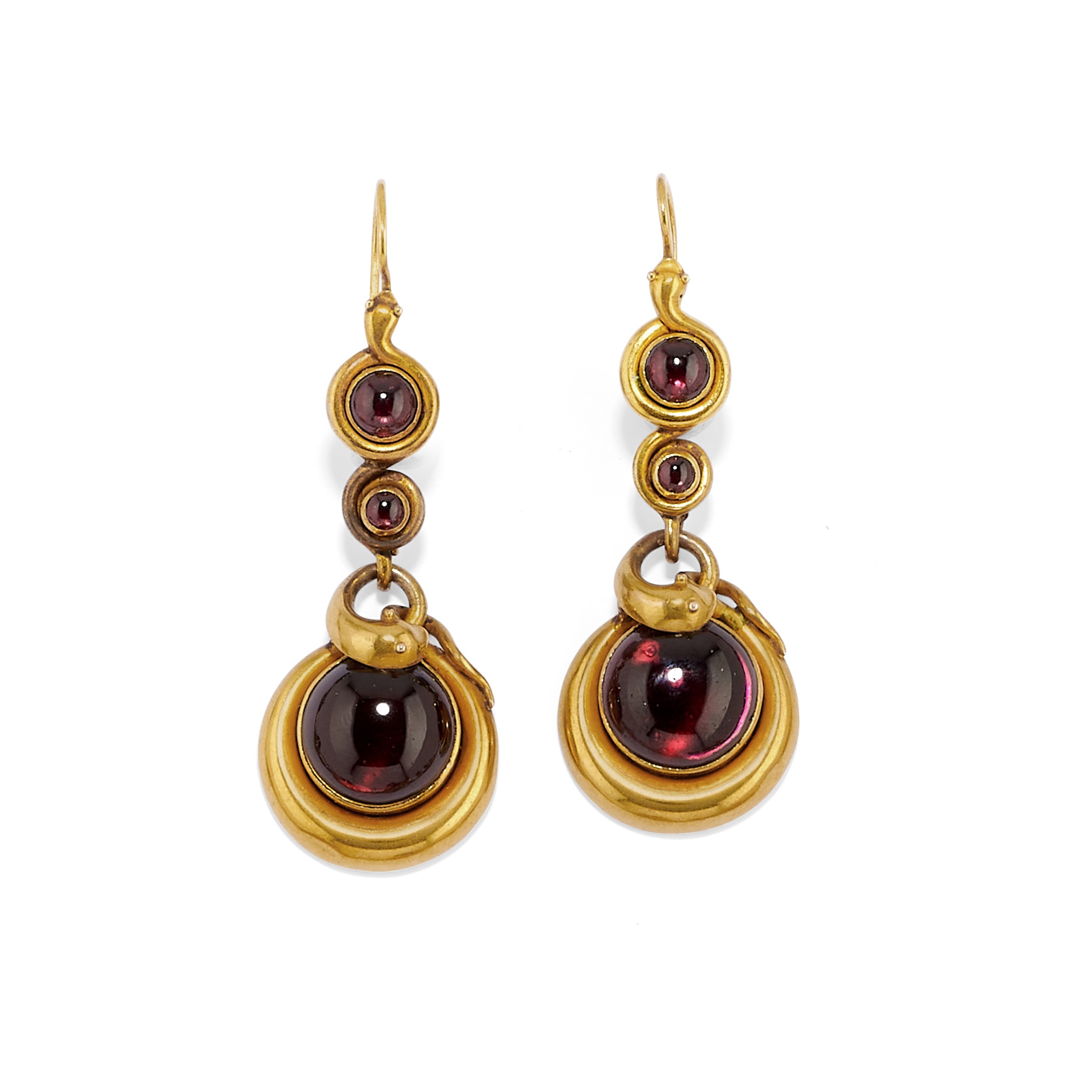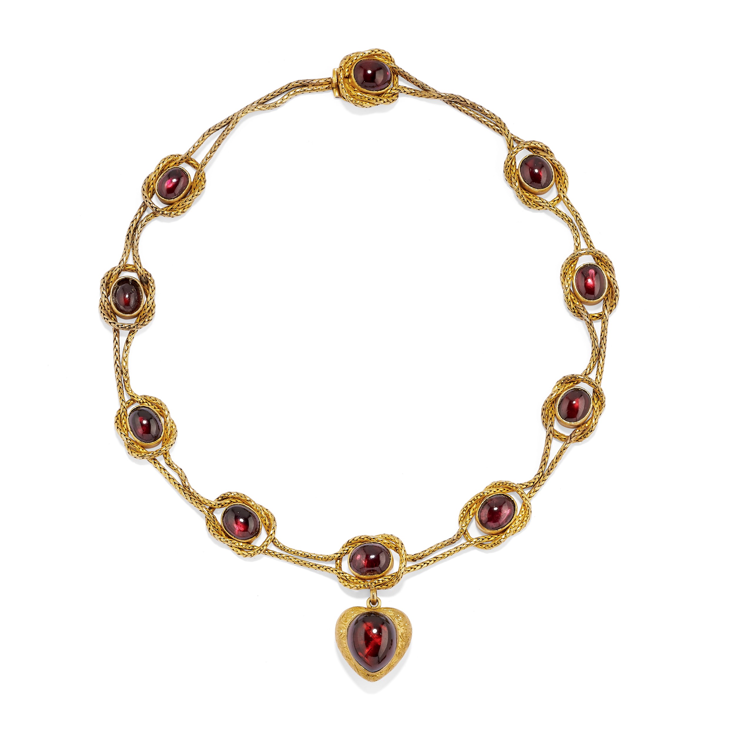 consisting of a necklace with oval cabochon cut garnets and a heart shaped relic pendant and a pair of earrings with snakes holding round cabochon cut garnets, with clasp fastening.