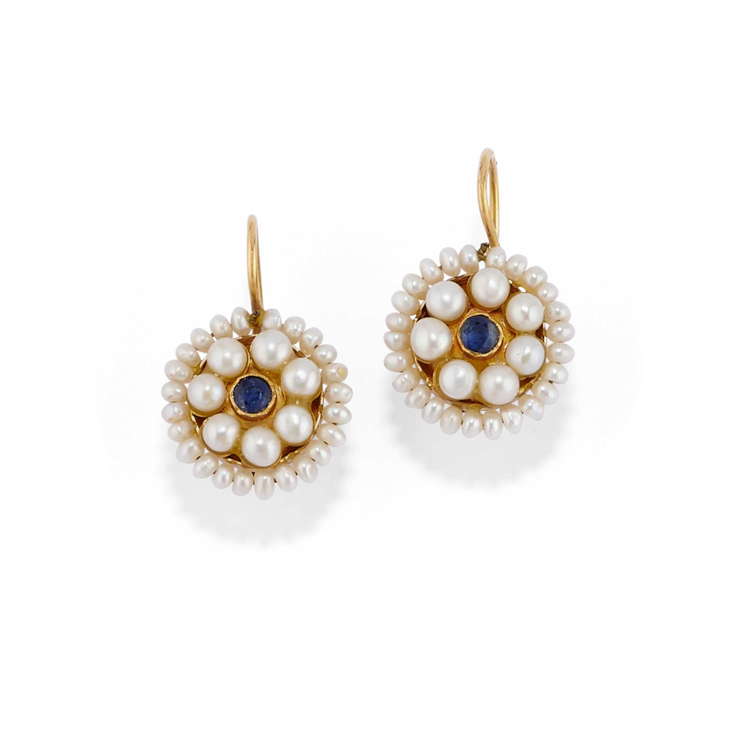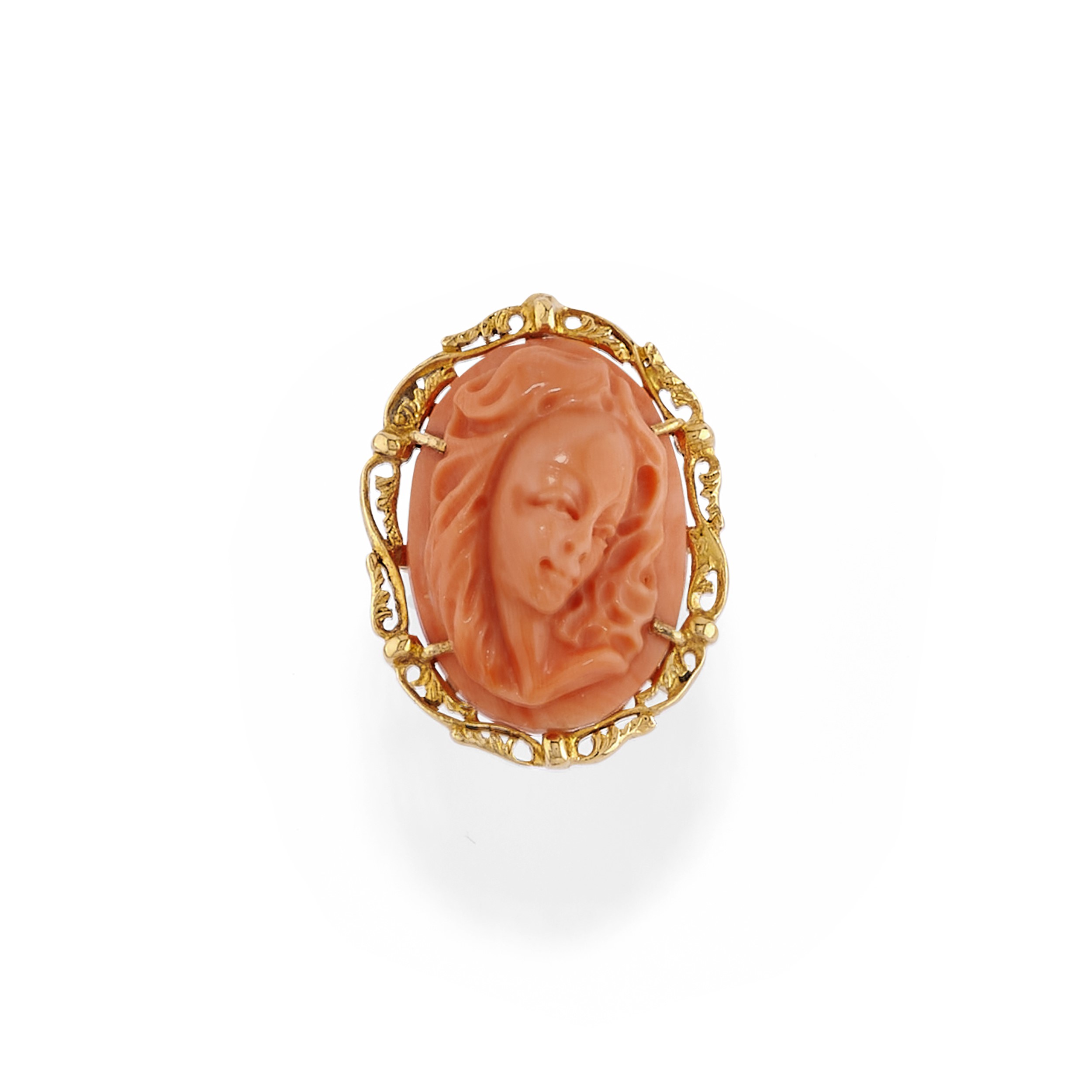 comprising a ring with oval Japanese coral engraved with a female profile measuring mm 25,50x18,30x8,60 and a pair of flower earrings with cultured mabé pearls, micro pearls and round cut sapphire, with a clasp and clip fastening, with certificate.