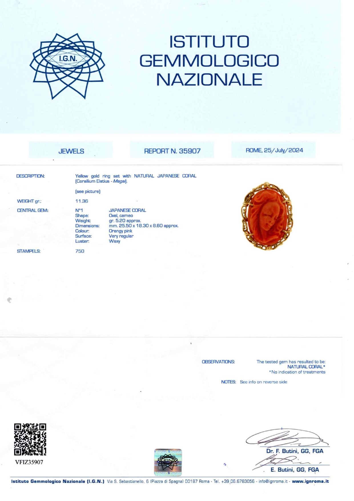 The ring is accompanied by gemmological certificate No. 35907 dated 25/07/2024 IGN, Rome