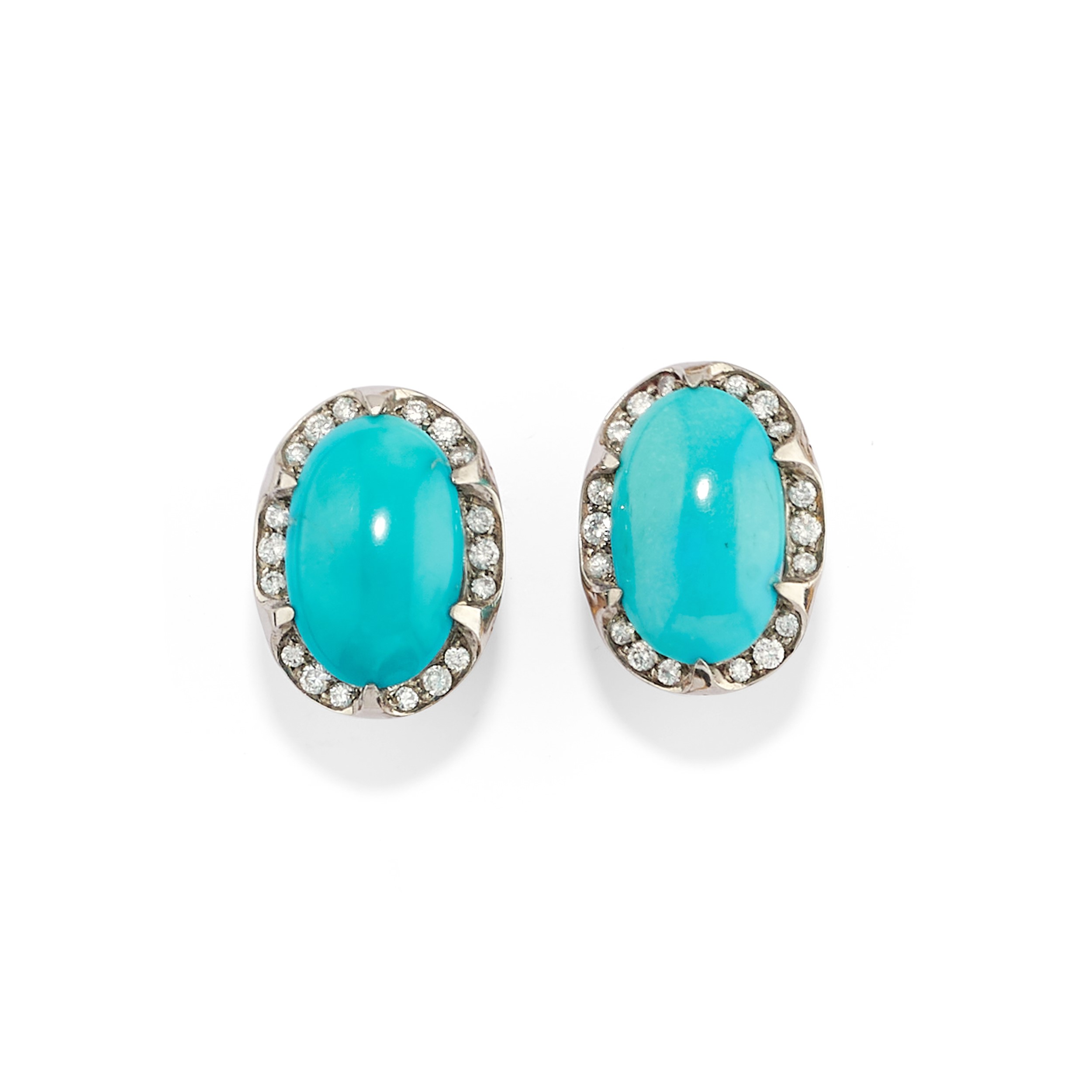 18k bicolor goldconsisting of a ring and a pair of earrings with a clip fastening, oval-cut cabochon turquoise in the centre and a brilliant-cut diamond surround.