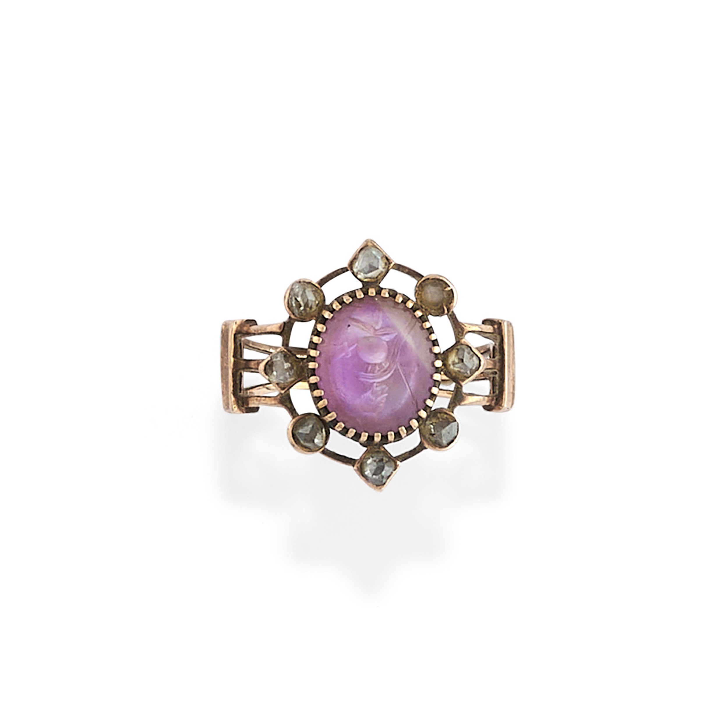 low carat yellow goldone with a round cut cabochon garnet and one with a glass paste stone and rose cut diamonds.