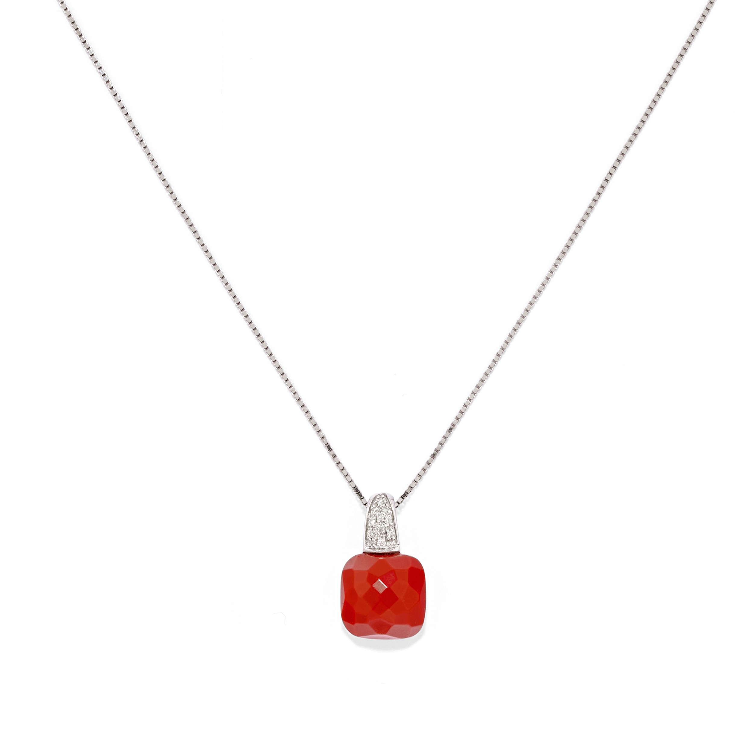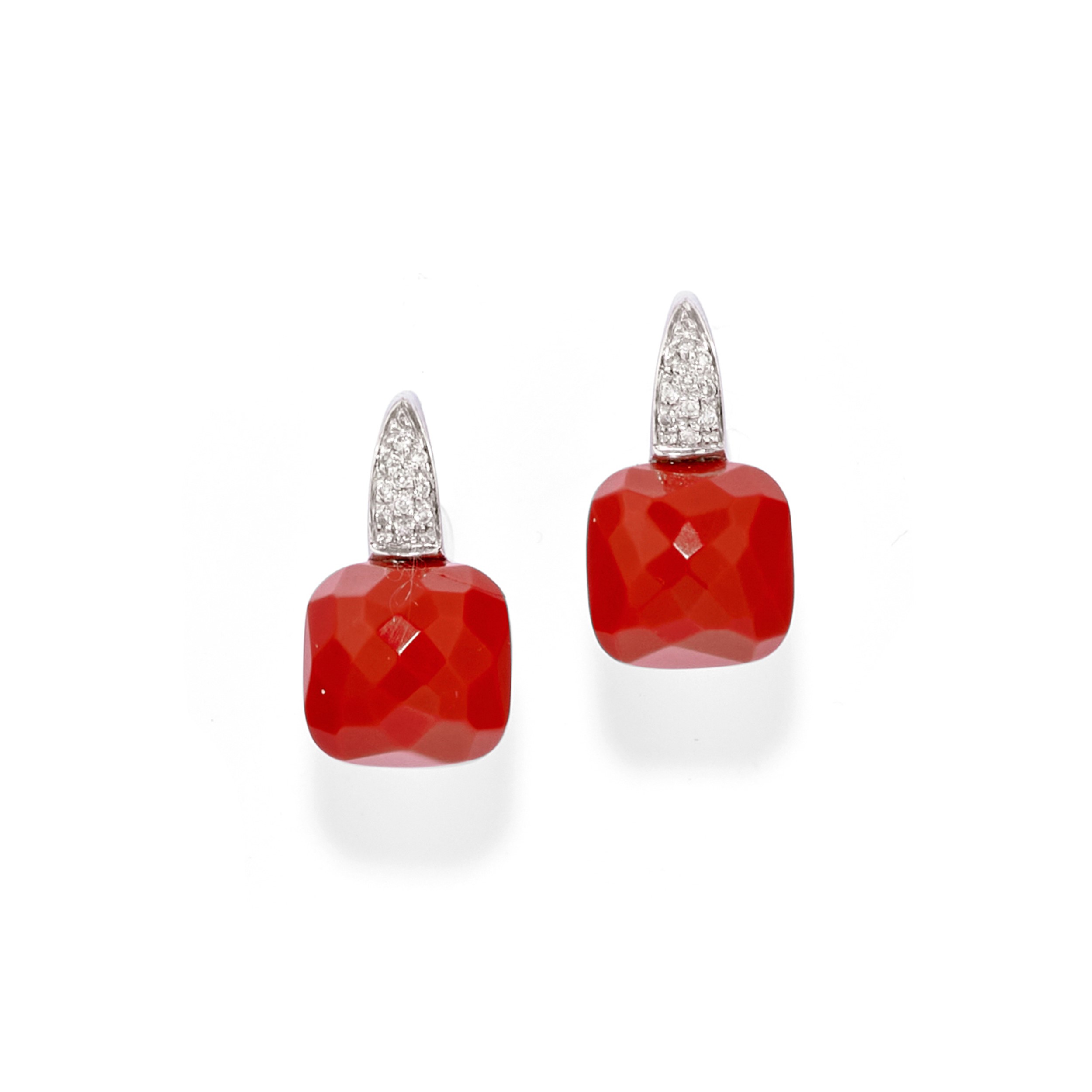 18k white goldconsisting of a ring, a necklace with pendant and earrings fitted with French wire, with facetted square coral and brilliant-cut diamonds totalling approx. ct 0,50.