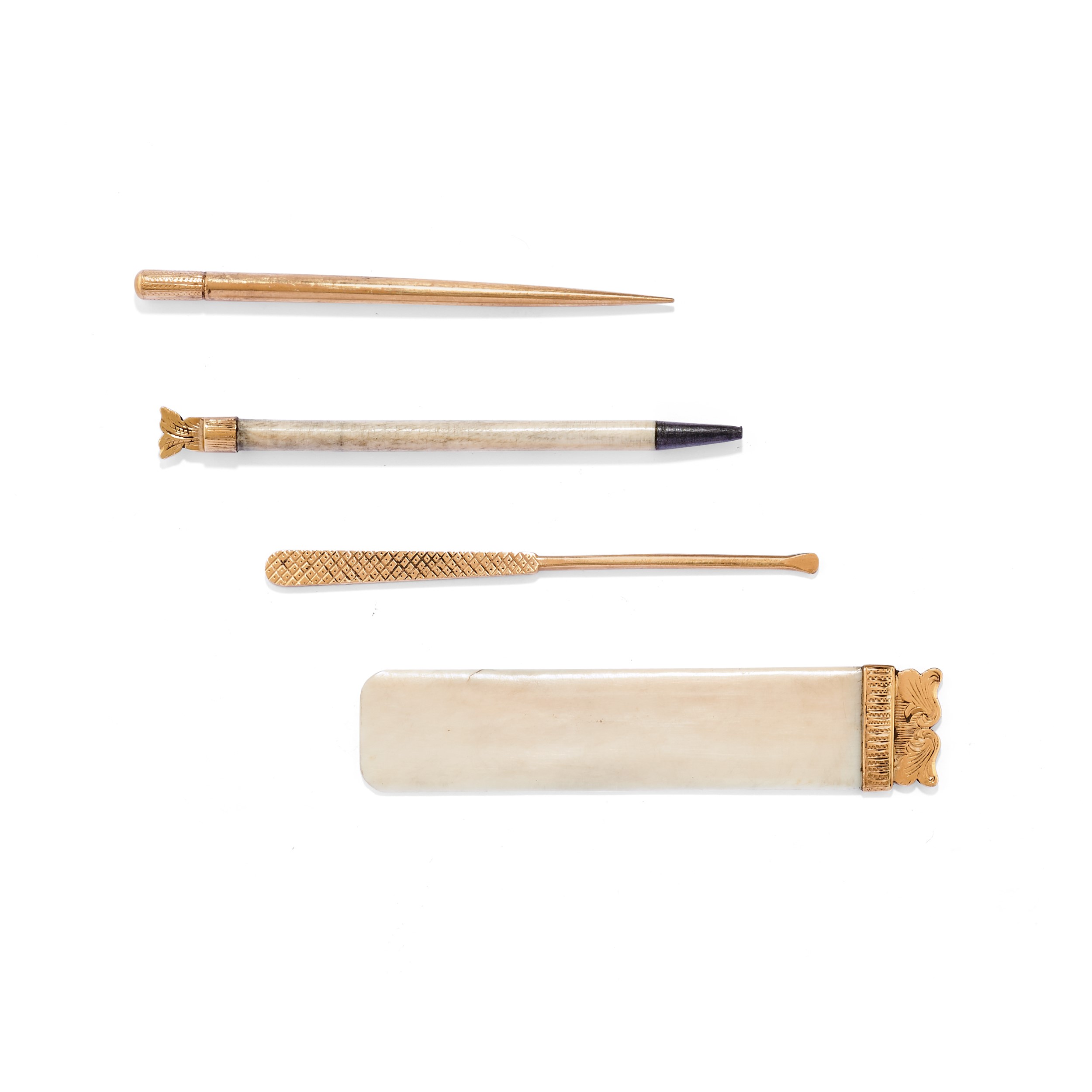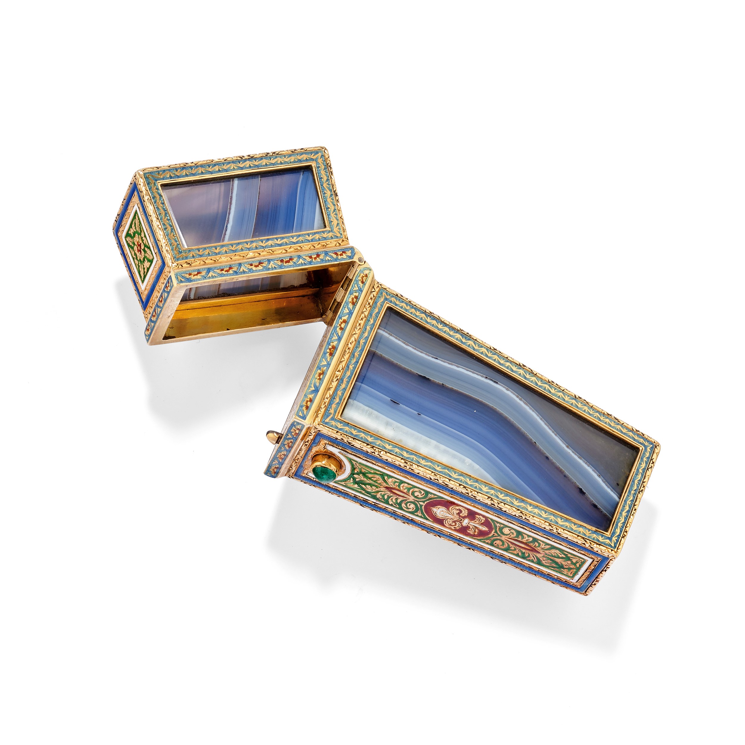 18k yellow goldof trapezoidal shape, with veined chalcedony, lid opening button decorated with round cabochon emerald, containing four charting instruments, fully engraved and decorated with polychrome enamels in floral designs, on the side “fleur de lys” of France, within case.