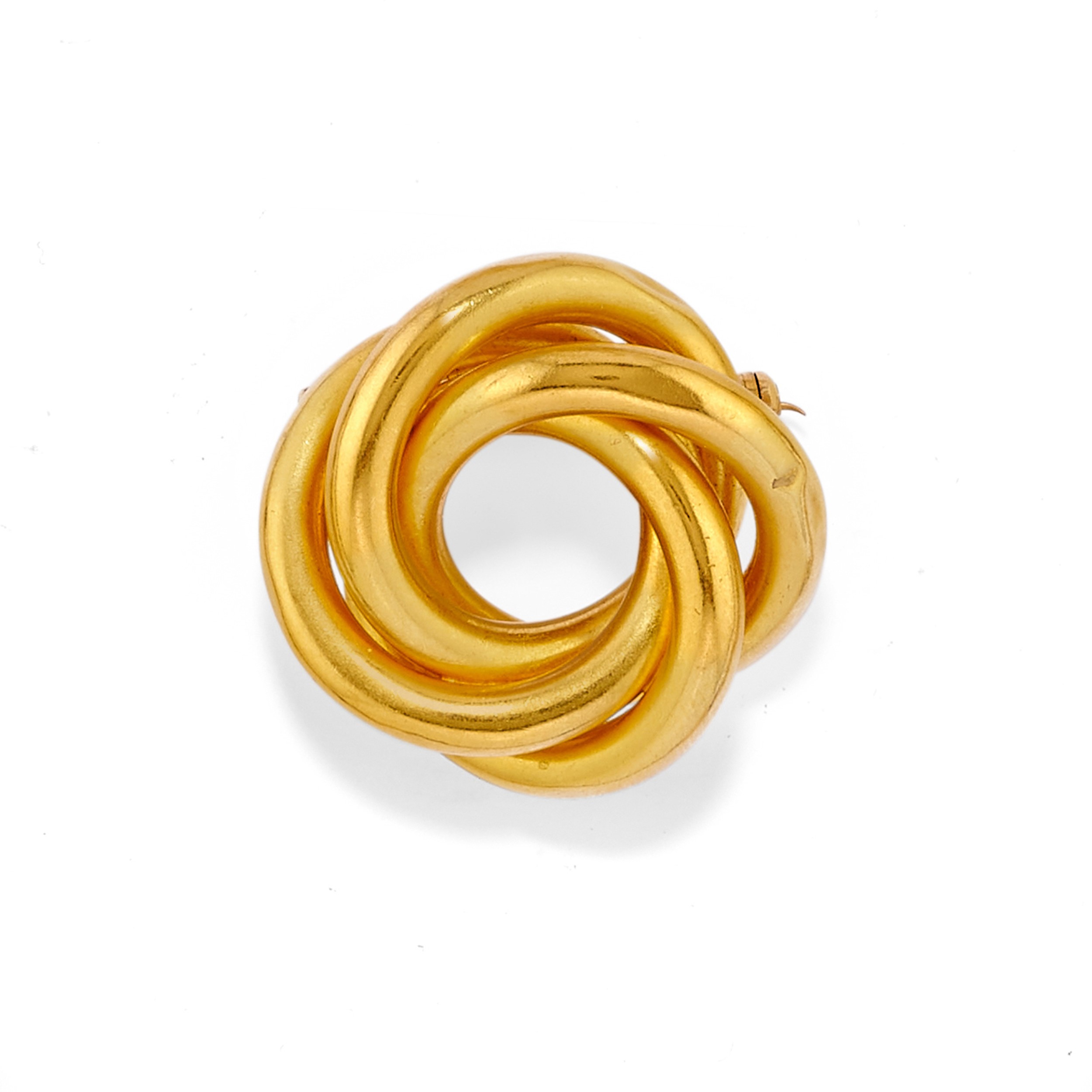 18k yellow goldone brooch of a know design, the other with oval pattern and round-cut sapphires, defects (dents).