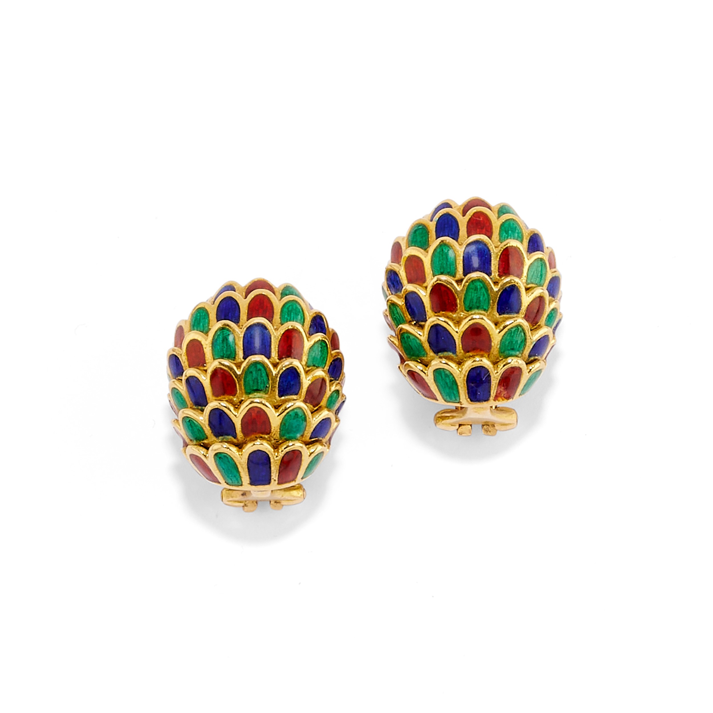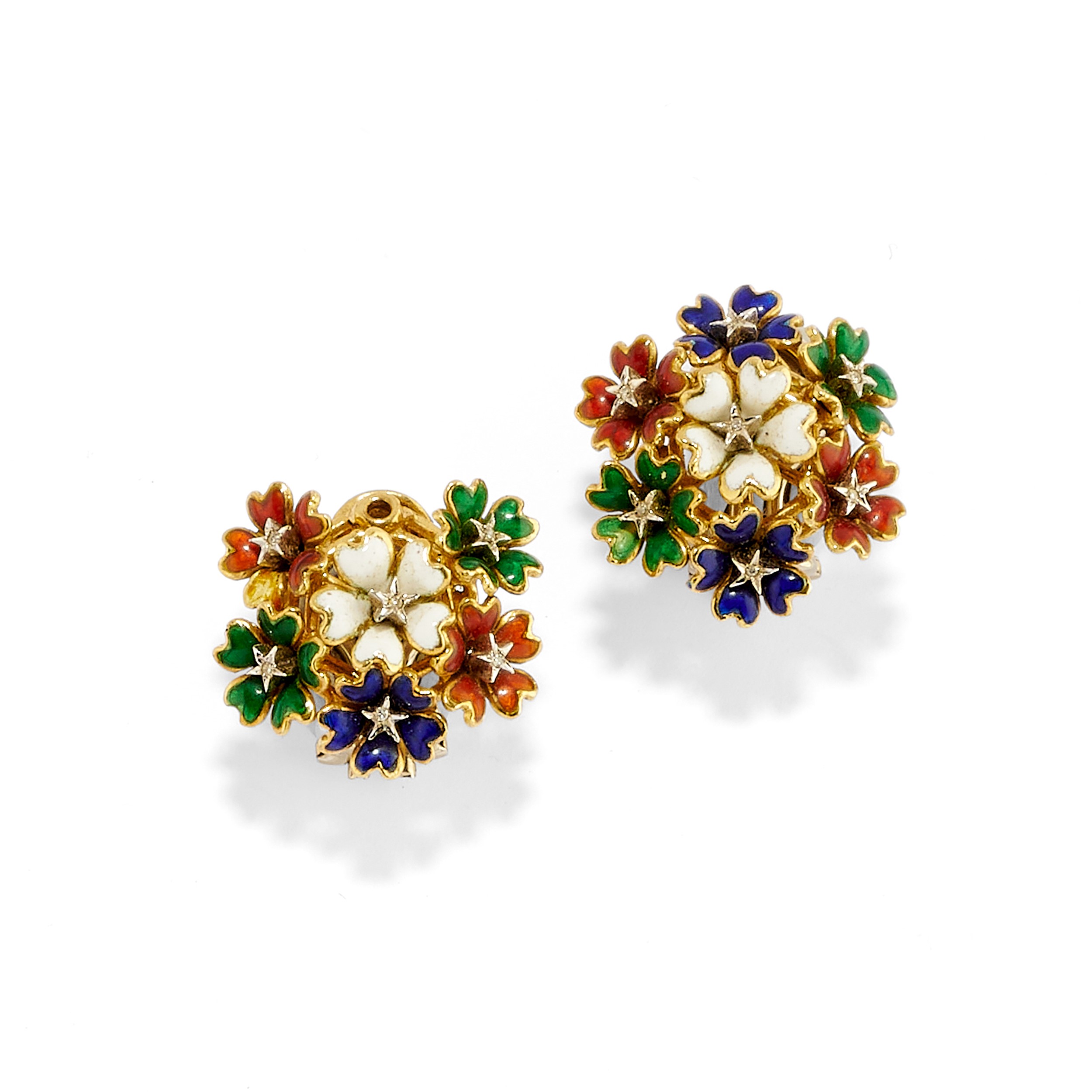 18k yellow goldone pair featuring floral design, the other pair with leaf motifs, both decorated with polychrome enamels (green, blue, red, and white), fitted with clips, defects (a small flower missing)