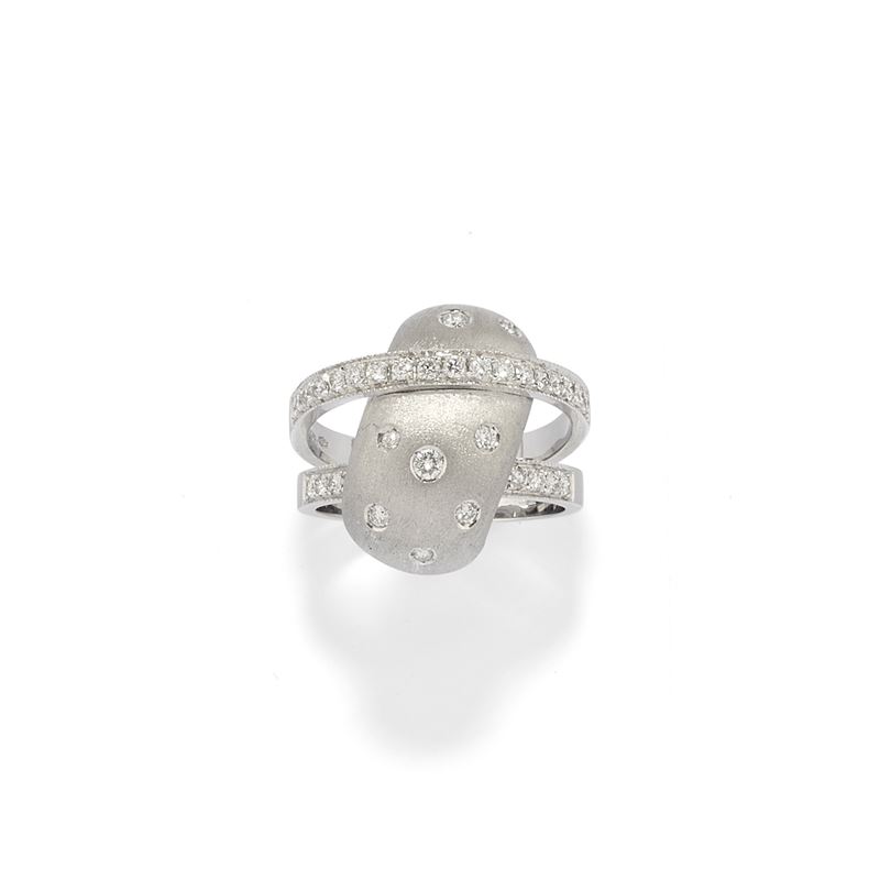 set with a satin nugget in the center and double band with brilliant-cut diamonds, signed.