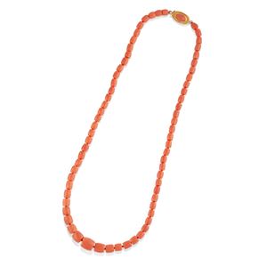 18k yellow goldconsist in a single strand necklace of faceted barrel beads of approx. mm 11,00/6,00 and a two strand bracelet of faceted barrel beads of approx. mm 6,00/6,50.