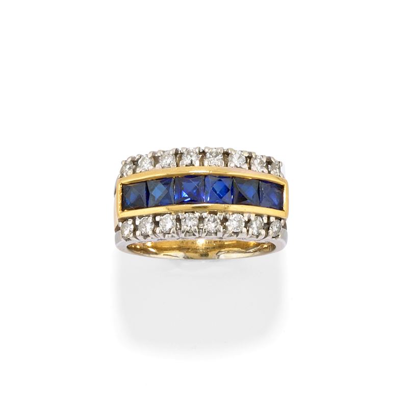 18k two-color goldset with carré-cut sapphires totalling approximately ct 1,00 and brilliant-cut diamonds totalling approximately ct 0,50.