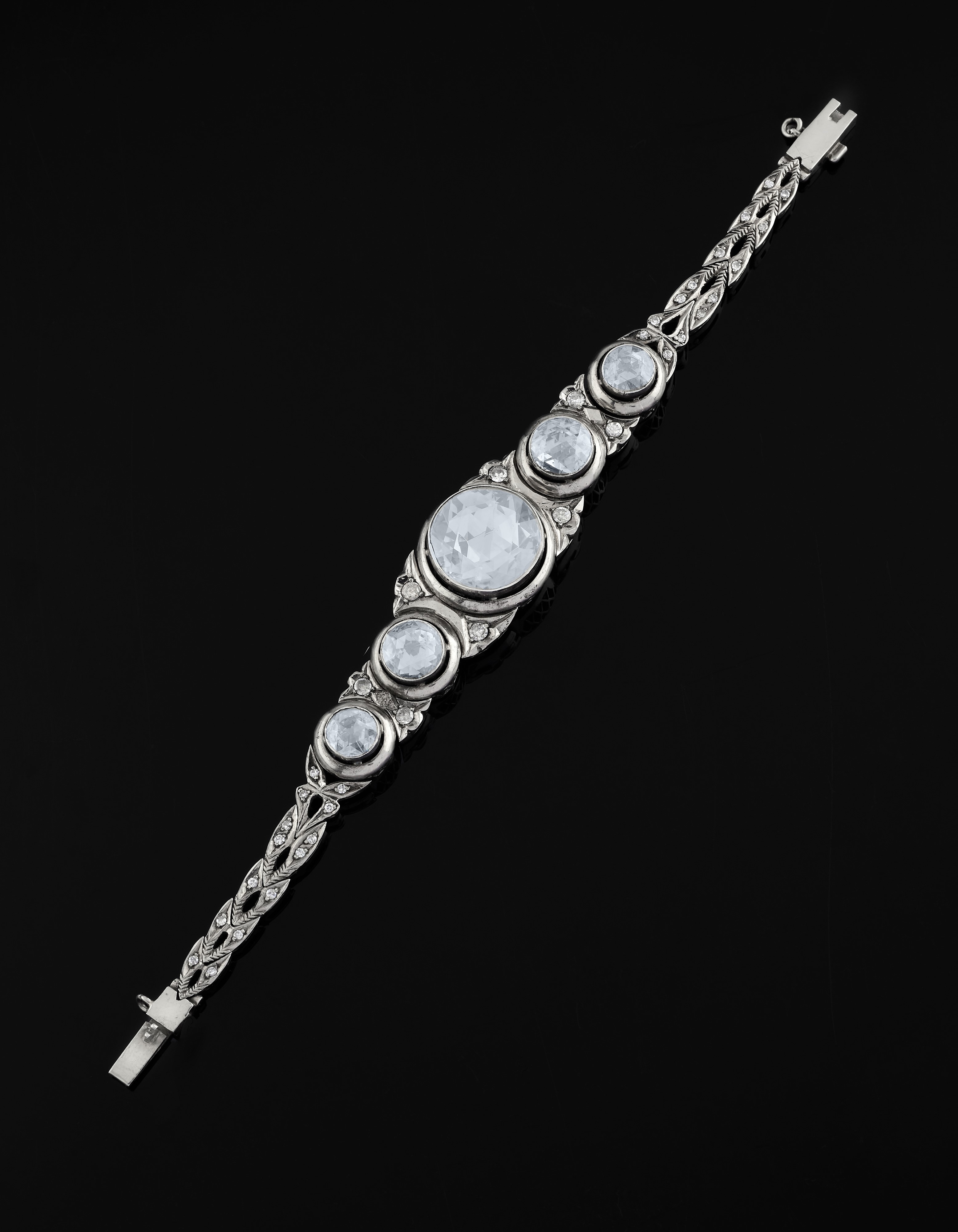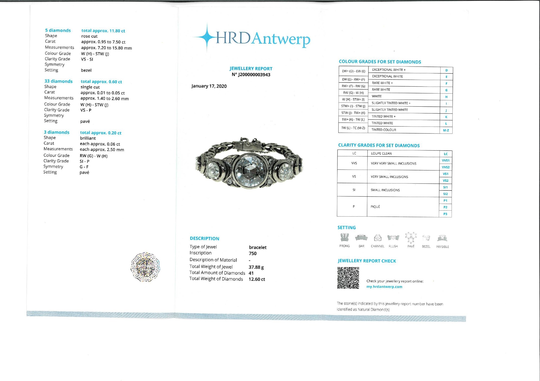 18k white goldwith five rose cut of approx. ct 11,80 (from approx. ct 0,95 to ct 7,50), colour H-J, clarity VS-SI, thirty three single cut diamonds of approx. ct 0,60, colour H-J, clarity VS-P, three brilliant cut diamonds of approx. ct 0,20, colour G-H, clarity SI-P.