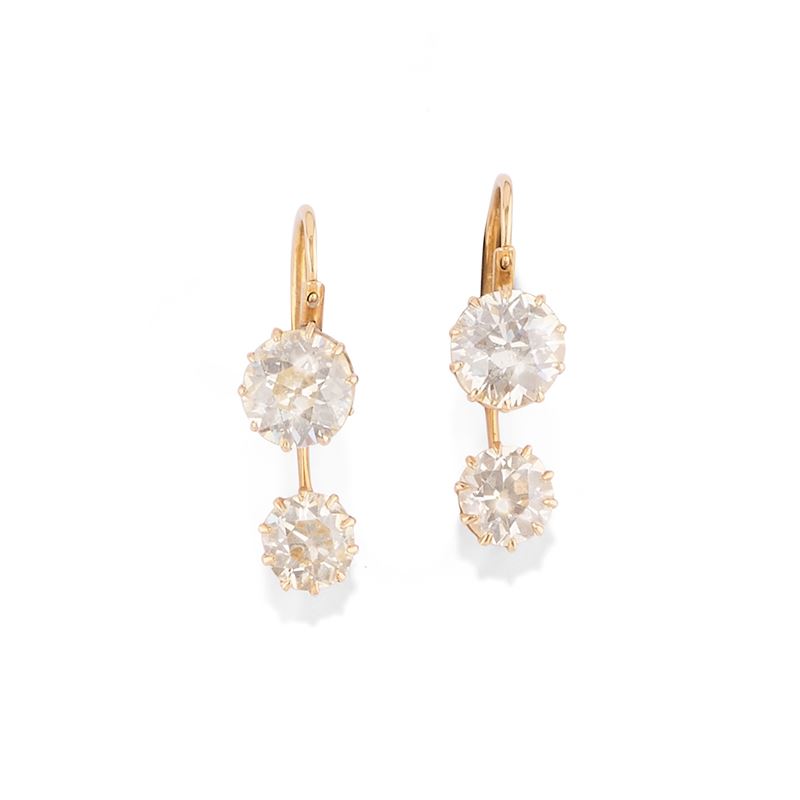 made with two old cut diamonds of approx. ct 6,00, pin clasp, with case.