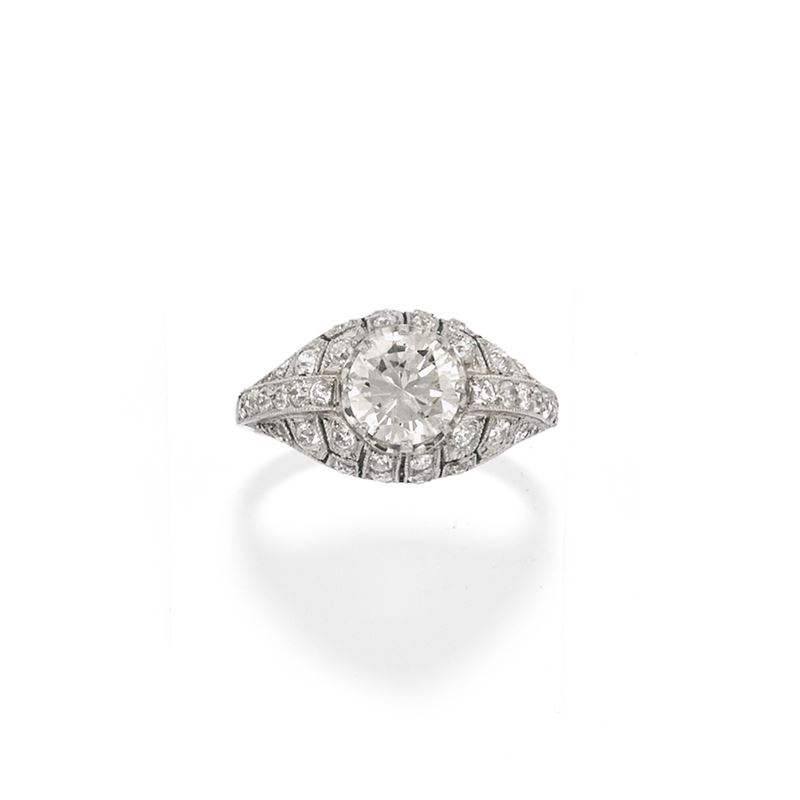 platinumset with a brilliant-cut diamond of approximately 1.30 ct (prob. color L, clarity VS) and milligrain decoration with old cut diamonds.