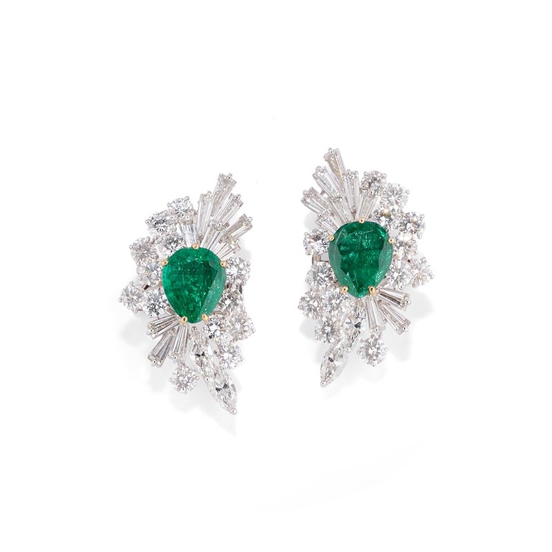 at the centre two Colombian pear cut emerald of ct 2,69 and 2,67, surrounded by brilliant, navette and tapered baguettes cut diamonds of approx. ct 7,00.