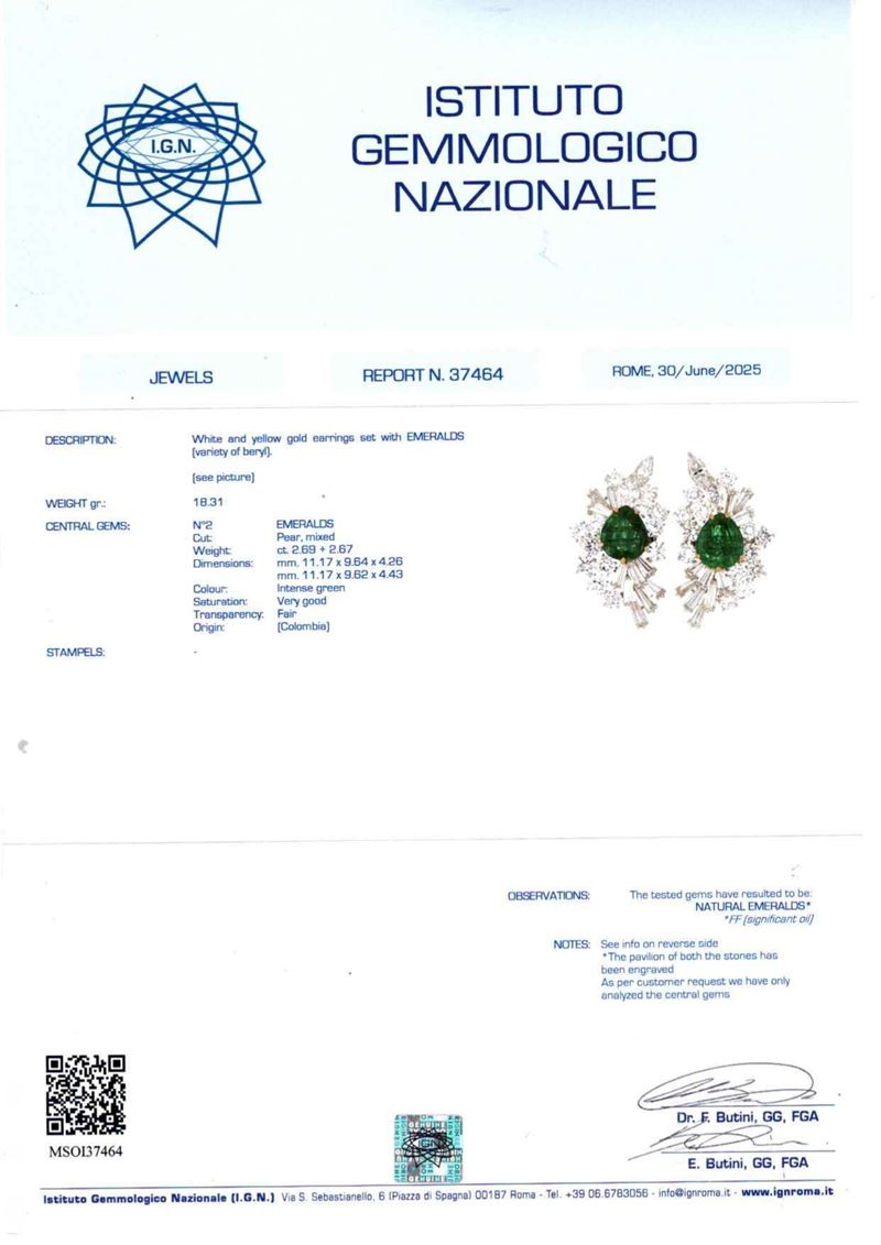 The two emeralds are accompanied by gemmological certificate n. 37464 dated 30/6/2025, IGN Rome.