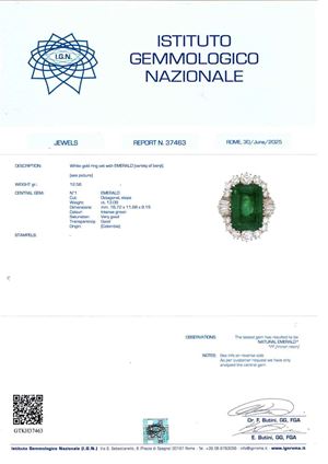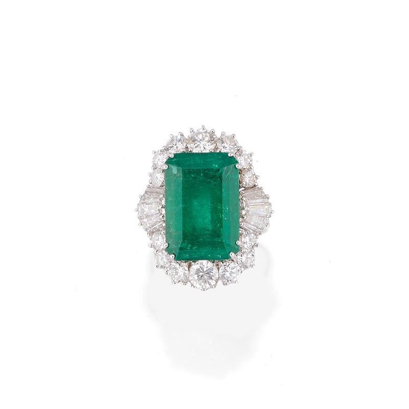 18k white goldwith Colombia octagonal step cut emerald of ct 13,09 with octagonal outline in brilliant cut and tapered baguette diamonds of approx. ct 3,00.