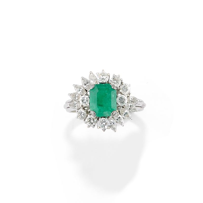 18k white goldat the centre a rectangular emerald cut with an octagonal outline of approx. ct 1,00, surrounded by brilliant cut diamonds and marquise.