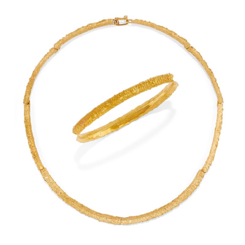 18k yellow goldconsisting of a rigid necklace and bangle.