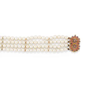 18k yellow goldconsist in a four strand bracelet of cultured pearls of approx. mm 6,00/6,50, closure with round cut sapphires and rubies, and brooch with flowers decorated with round cut rubies and sapphire.