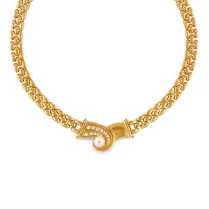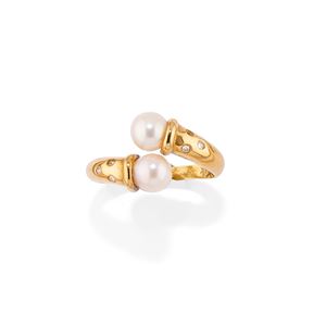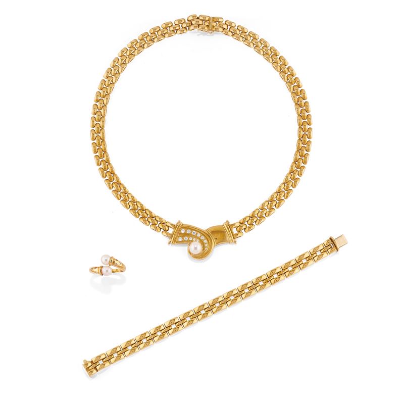 18k yellow goldconsist in a necklace with cultured pearls and diamonds, a ring with two cultured pearls and small diamonds, a bracelet with a geometric chain, defects (ring with imperfections, one diamond missing).