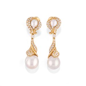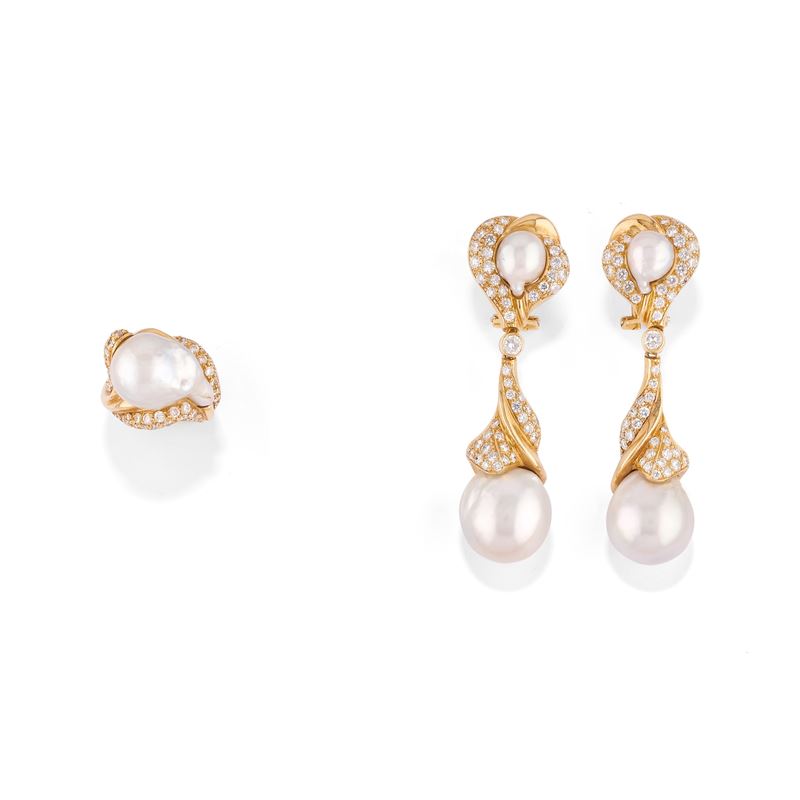 18k yellow goldconsisting of a ring and a pair of earrings with pin and clip fastening, embellished with baroque cultured pearls and brilliant cut diamonds of approx. ct 3,00.