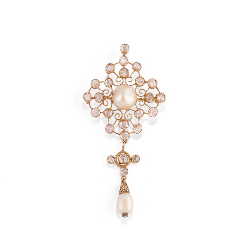 16k yellow goldwith rose cut diamonds and pearls (prob. natural).