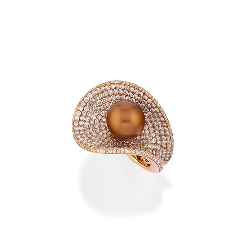 18k rose goldof a calla lily design, with a 10.50-11.00 mm cultured chocolate pearl in the centre set with brilliant-cut diamonds.