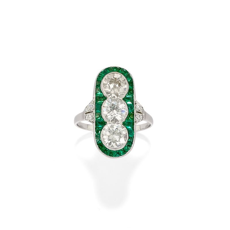 18k white goldwith three old-cut diamonds totalling approximately 2.00 ct within a carré-cut emerald border.