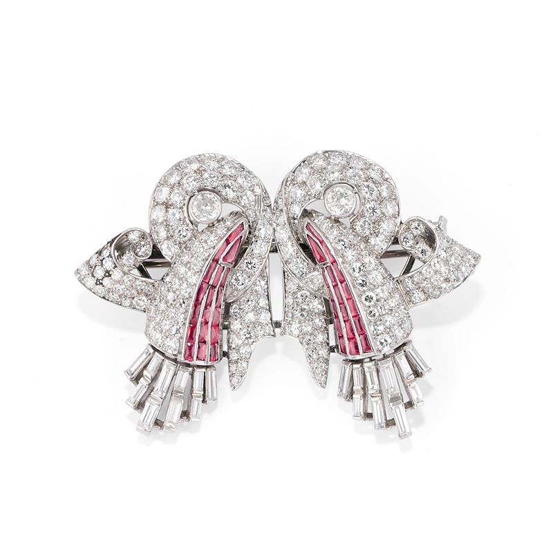 platinumdouble clip with brilliant, baguette and huit-huit cut diamonds of approx. ct 6,00, cabochon cut rubies.