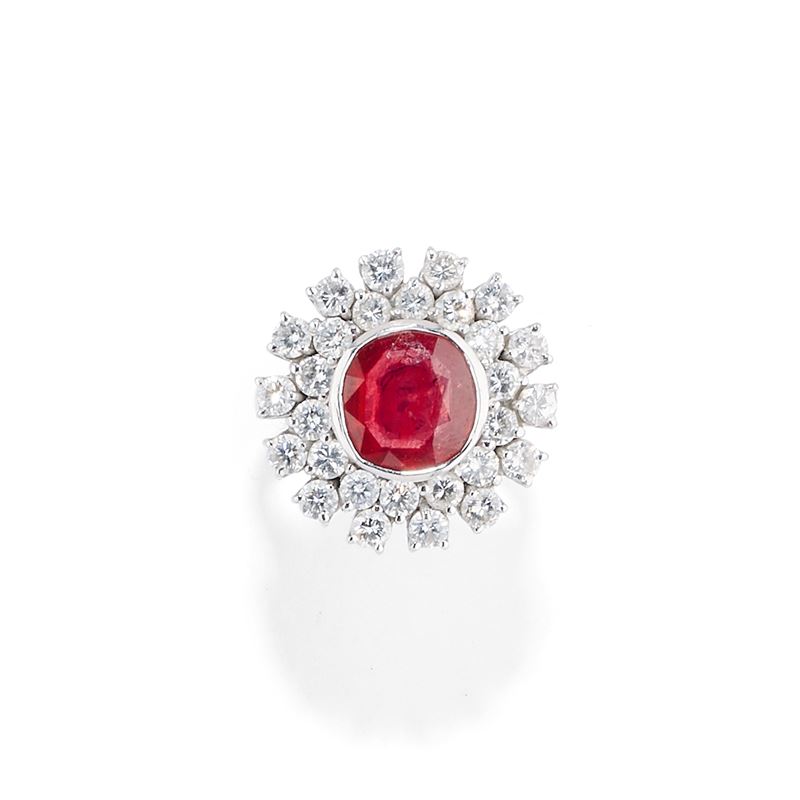cushion cut ruby glass filled centre stone of approx. ct 3,60, surrounded by brilliant cut diamonds of approx. ct 1,50.