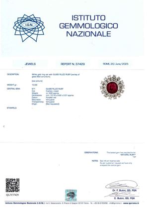 The glass filled ruby is accompanied by gemmological certificate n. 37429 dated 20/06/2025, IGN Rome.