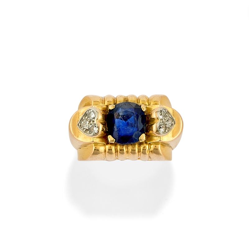 set with a cushion-cut sapphire of approximately ct 3.10 (heat) at the centre, decorated on the sides with old-cut diamond heart motifs.