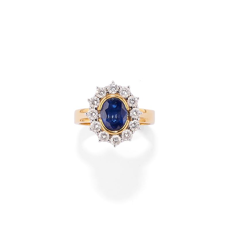 18k yellow goldflower shaped with oval cut sapphire of approx. ct 1,80 surrounded by brilliant cut diamonds of approx. ct 1,00.