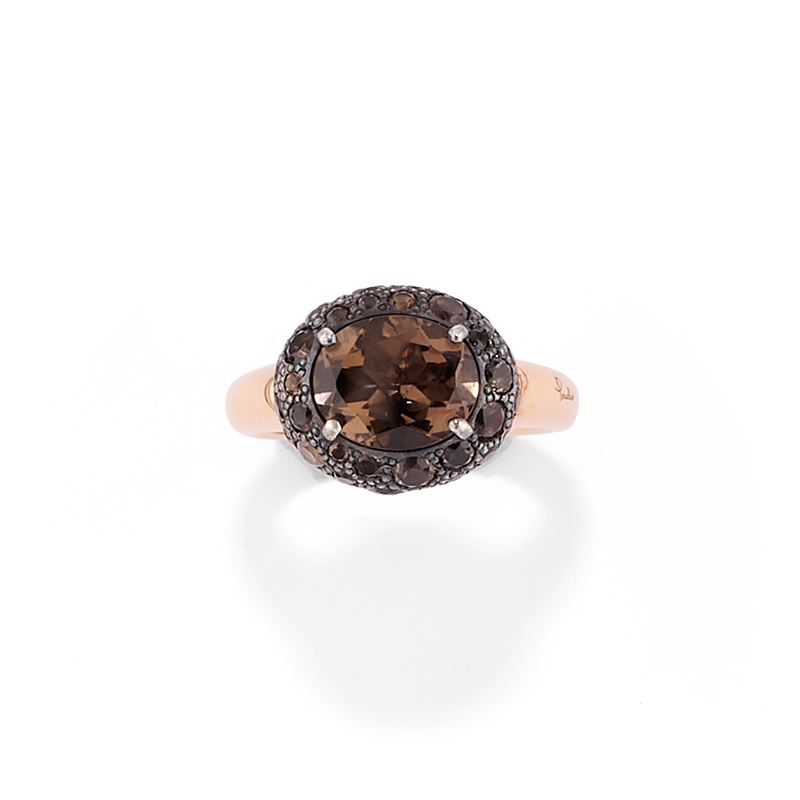 18k pink gold and silverwith oval and round cut smoky quartz center gemstones.