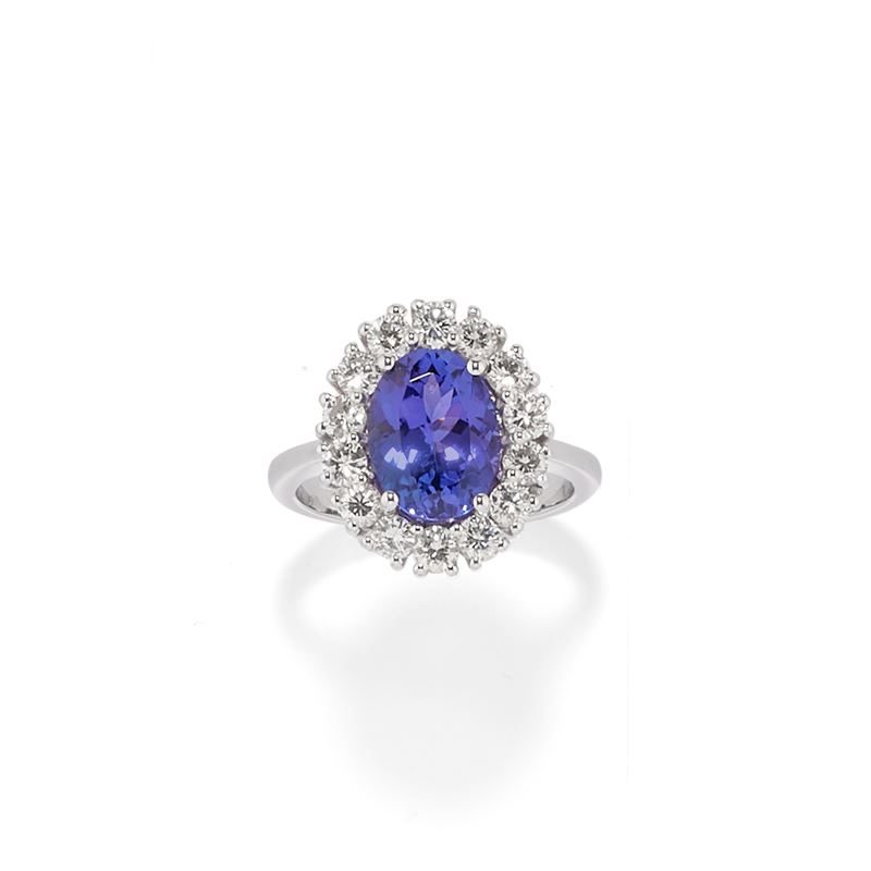 18k white goldset with an oval-cut tanzanite of approximately 2.50 ct surrounded by brilliant-cut diamonds totalling approximately 1.00 ct.