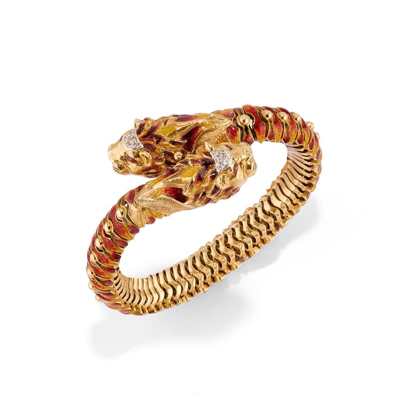 18k two color goldsoft knit in polychrome enamel, tiger head terminals in contrarié, small diamonds for decoration.