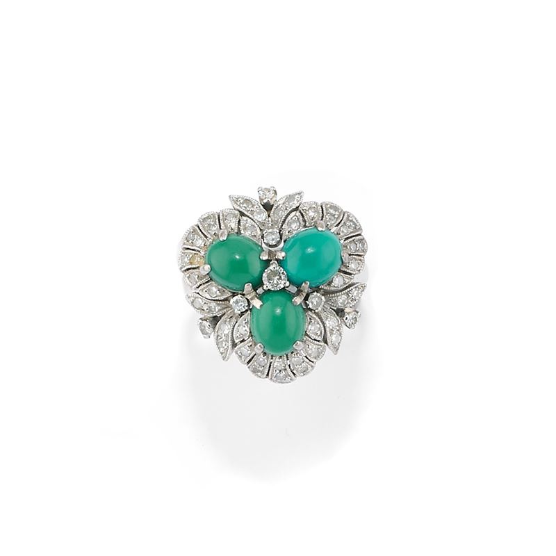 18k white goldthree oval cabochon turquoise in the centre, surrounded by huit-huit and brilliant cut diamonds, with milgrain detailing.