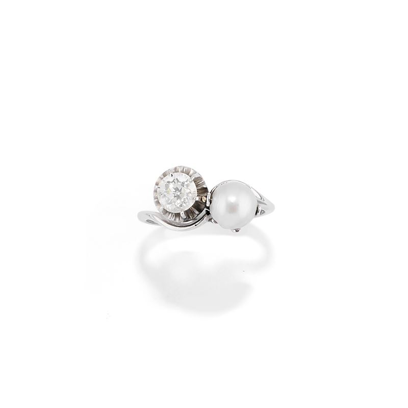 18k white goldone with four brilliant cut diamonds of approx. ct 0,60, the other with a cultured pearl on a swivel pin and an old cut diamond of approx. ct 0,80.