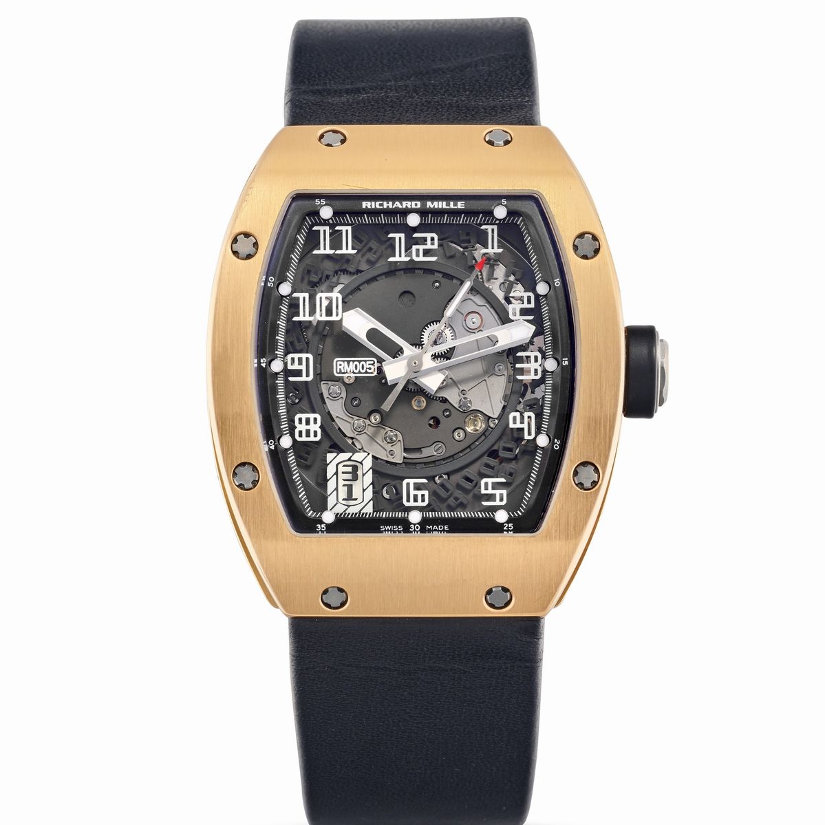 Notes: Richard Mille created his first watch, the RM001 Tourbillon, in 2000. Since then, the brand has quickly established a niche for itself thanks to the avant-garde design and cutting edge materials and technical innovations. Introduced in 2004, the RM005 was the first automatic model from Richard Mille, as well as its first non-complicated timepiece. It was available in rose or white gold, platinum and titanium. The model is powered by the caliber 005, a self-winding movement that was the first to use a variable geometry rotor: this innovation allows the movement winding mechanism to be personalised to the owner’s lifestyle, to prevent overwinding and ensure better performances.