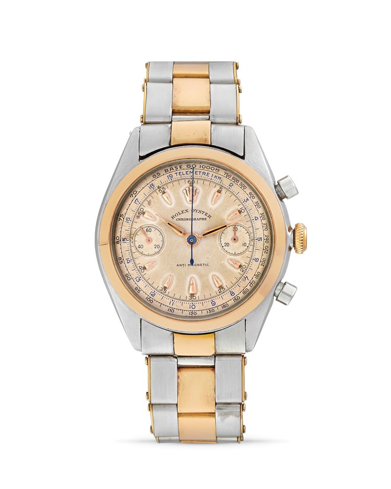 Reference 4500 was produced between 1946 and 1947, marking a turning point for Rolex in the design of its chronographs, with the introduction of a new case shape featuring straighter and more pointed lugs. The model is known as the grandfather of the iconic Daytona, and was offered in stainless steel, yellow gold, pink gold, and stainless steel & gold, such as the present watch, by far the rarest version.